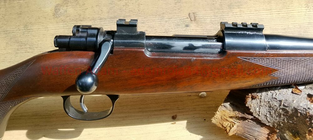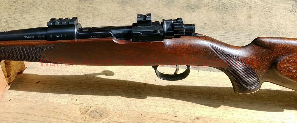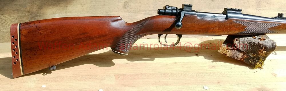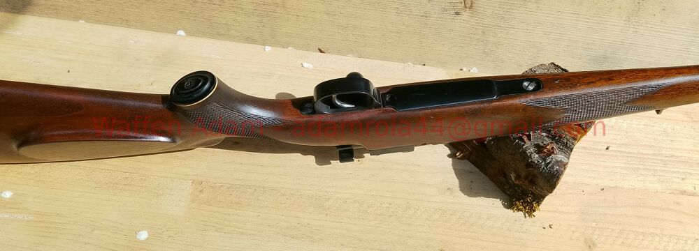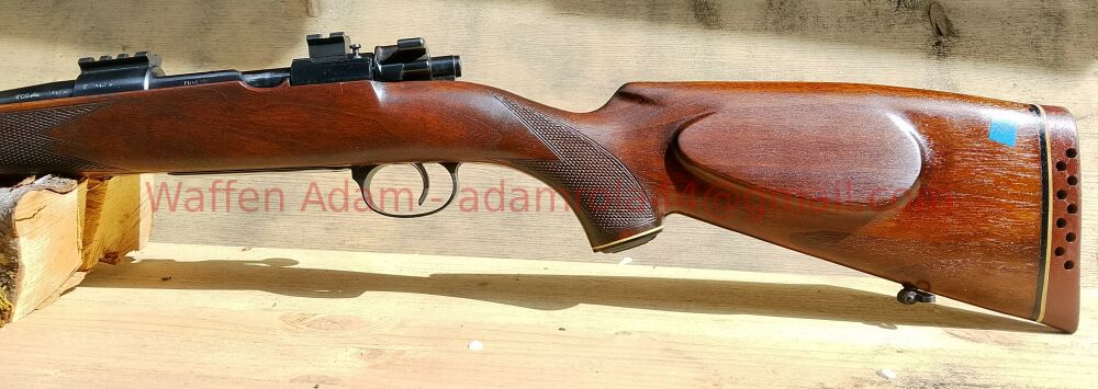Nussbaum Schäftung mit leichtem Schweinsrücken, Deutsche Backe ventilierter Schaftkappe, Schaftlänge 365mm, Pistolengriff. Sauber geschnittene Fischhaut. System mit Weafer (Picatynni ) Basen. Standard Druckpunkt Abzug. Rasate Patrone für grössere Distanzen und Gebirge.