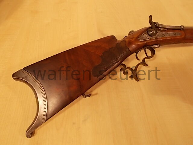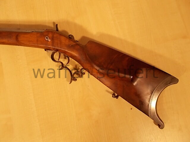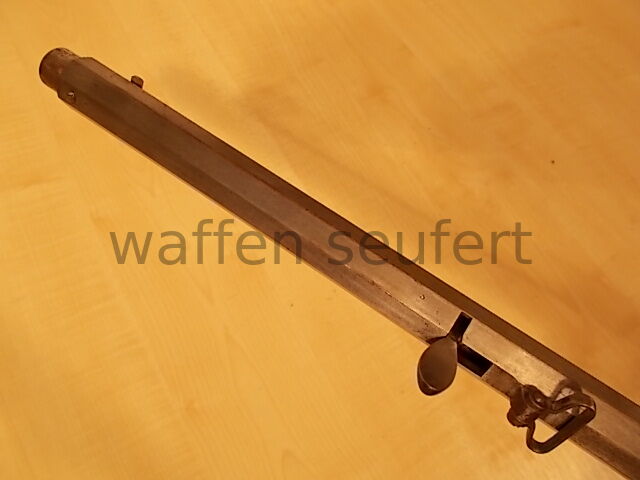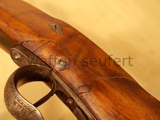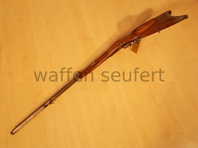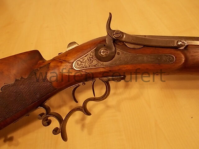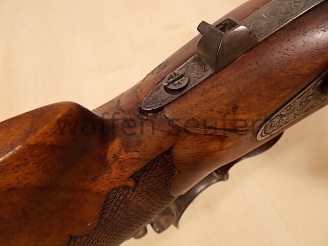 Zimmerstutzen Kaliber .4mmlang von W. L. Würflein in Kitzingen um 1890. Sammlerrarität und hochwertige Büchsenmacherkunst mit viel Liebe zum Detail aus dem Ende des 19. Jahrhunderts . Meisterliche reichhaltige Jugenstilgravuren. Die Laufwurzel mit Eisenhinterschaft graviert mit Arabesken. Die Schlossplatte und der Abzugsbügel mit Fingerhaken graviert mit feinst gestochenen Blattarabesken, Eisenschaftkappe mit Blattarabesken und sehr feinen Randstichgravuren. Hochwertige Schäfterarbeit: Klassischer Sportschaft aus Wurzelmaserholz mit großer Bayrischer Backe und sehr feiner Fischhaut an der rechten Griffläche. Visierung feines Perlkorn auf Schwalbenschwanzbasis und verstellbare Kimme. Auf dem Eisenhinterschaft ist zusätzlich ein Aufnahmeblock mit Feststellschraube für einen Diopter mit 4-kant Halterung. Aushakbarer 8-kant Laufmantel aus Stahl 74 cm lang, Ø 23 mm dient zur Aufnahme des eigentlichen 21 cm langen Laufs mit verschraubter runder Laufmündung im Kaliber 4mmRF Lang, des Ladeblocks und des Zündsystems. Zum Laden wird der Hahn gespannt. Dann kann der vorne unter dem Lauf liegende Ladeblock mit Patronenlager mit dem Daumenhebel nach unten gedrückt und aus der Öffnung zum Laden einer Patrone entnommen werden. Doppelabzug mit sehr fein eingestellten Stecherabzug. Originalbeschriftung: Oben auf dem Lauf W. L. WÜRFLEIN IN KITZINGEN. Schaft am Kolbenhals durchgebrochen und wieder grob verleimt. Wir empfehlen die Verleimung sauber nachzuarbeiten. Die blanken Metallteile sind etwas fleckig. Sonst gepflegter sehr guter Zustand. 1-schüssig. Kaliber: .4mmRF Lang (4mmlang). Neubeschuss: Mellrichstadt CIP 10/2022. Lauflänge:74 cm mit Nuss. Gesamtlänge: ca. 111 cm. Gewicht: ca. 4,24 kg. Zum Kauf dieses Produkts ist die Vorlage der Erwerbsberechtigung erforderlich!