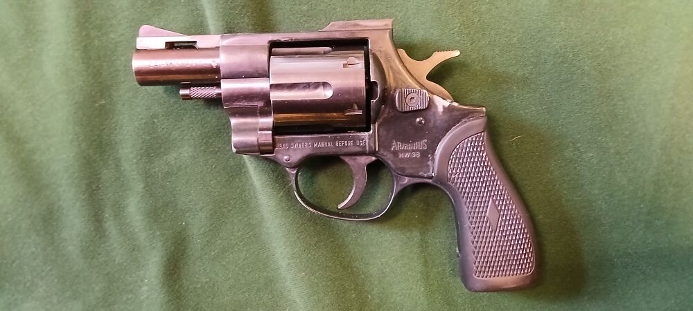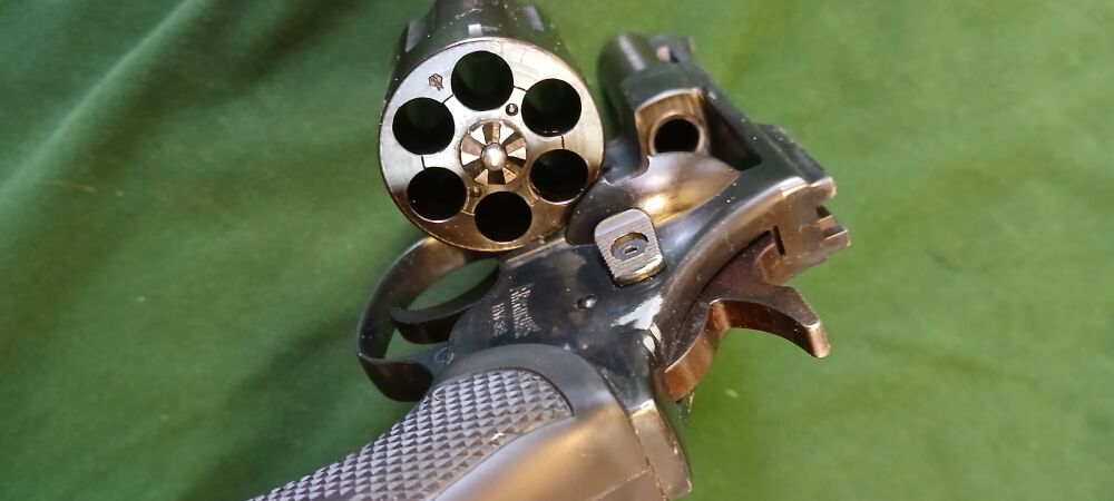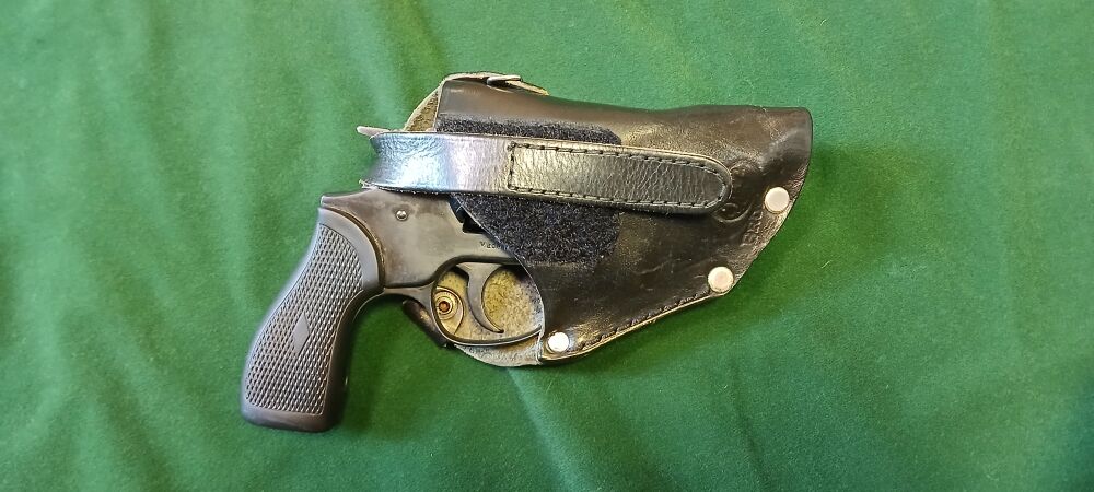 Kurzer führiger Fangschuss-Revolver, Double Action, 57 mm Lauflänge, 6 Schus-Trommel, mit passendem Holster inkl. Klemmfeder für den Gürtel Zustand sehr gut, nur am Rahmen eine Scheuerstelle? vom Hol... ...weiterlesen