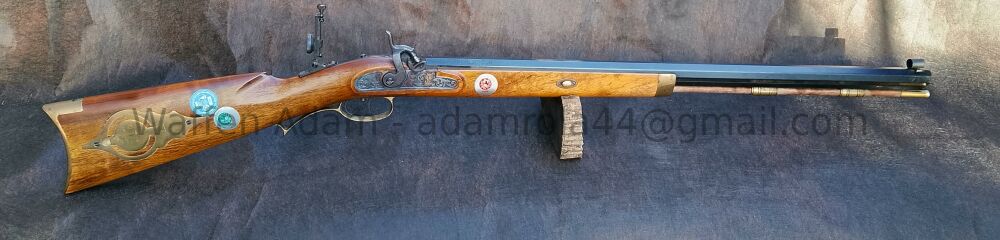 Hawken Rifle, gezogener Oktagon-Lauf, Stainless Piston, Deutscher Stecher mit Messing Abzugsbügel, Patchbox. Eingeschobenes Korn mit Sattel.