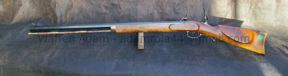 Hawken Rifle, gezogener Oktagon-Lauf, Stainless Piston, Deutscher Stecher mit Messing Abzugsbügel, Patchbox. Eingeschobenes Korn mit Sattel. Spindel Diopter Visier. Ladestock Holz mit Messingspitze u... ...weiterlesen