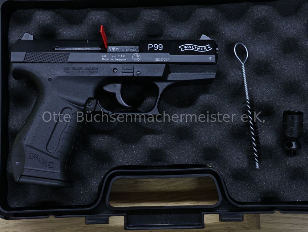 Hersteller: Umarex Walther P99  Kal. 9mm P.A.K Frei ab 18  Lieferumfang: - Abschussbecher  - Reinigungsbürste  - Waffenkoffer  - Magazin  - Walther p99 Freibleibendes Angebot. Änderu... ...weiterlesen