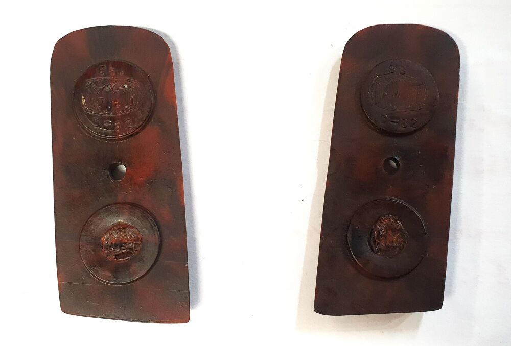 Griffschalen Griffschalen für Dreyse Modell 1907. Genaue Ausführung unbekannt. Die Griffschalen sind in einem Exzelenten Zustand. In der Innenseite ist ein stempel abgebildet, welche... ...weiterlesen