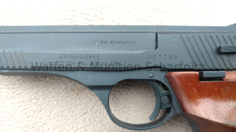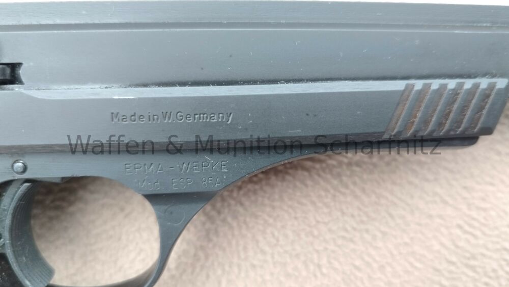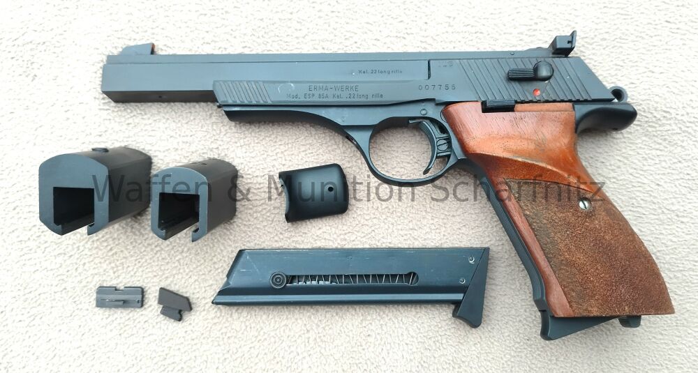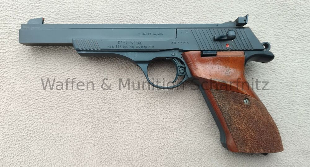 ERMA ESP 85 A .22 lr , Sportpistole, Jägermodell Hersteller: ERMA Modell: ESP 85 A Rahmen: Stahl büniert Zustand: 2-3 technisch guter Zustand, leichte Gebrauchsspuren Kaliber: .22lr Griffstück... ...weiterlesen