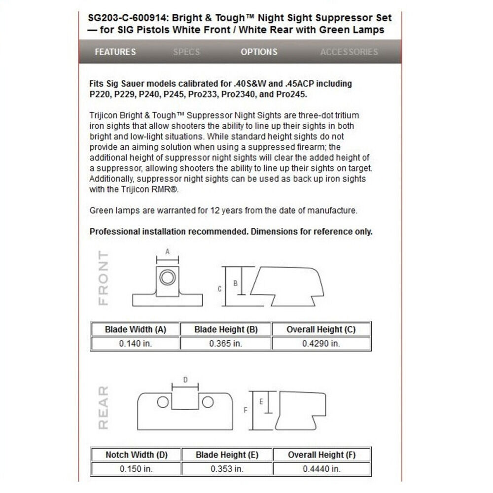 Kaliber .40S&W und/oder .45Auto, Pistole SIG Sauer Modell P220, P229, P240, P245, P938, Pro233, Pro2340 und/oder Pro245 passt nicht für X-Five, Six und/oder LDC II Modelle, Bright & Tough Nacht Visierset grün mit Visierkorn grün selbstleuchtend 3-Dot weiß umrandet, hohe Ausführung für Supp-Schalldämpfer Modelle, Code SG203-C-600914 Trijicon USA. Nacharbeiten sind eventuell erforderlich - eine fachgerechte Montage wird empfohlen!