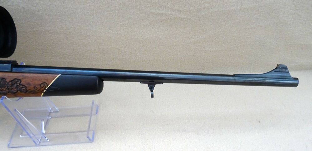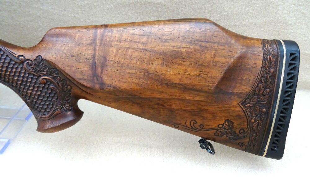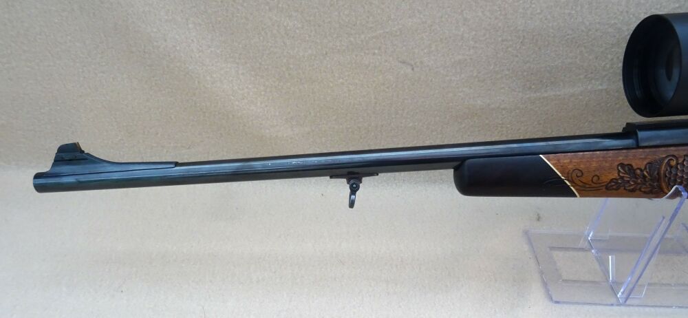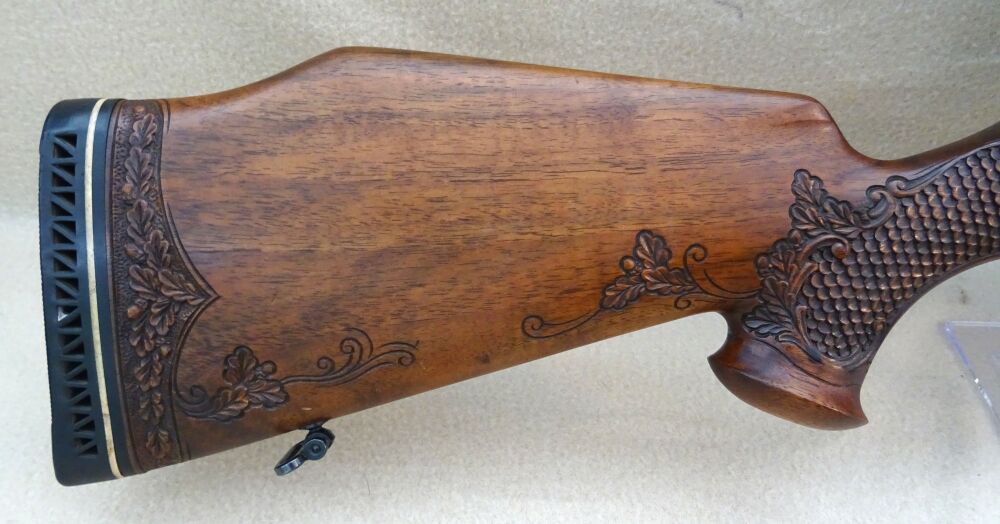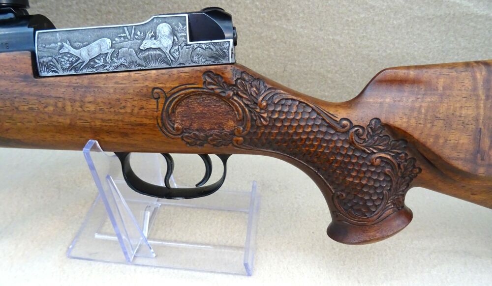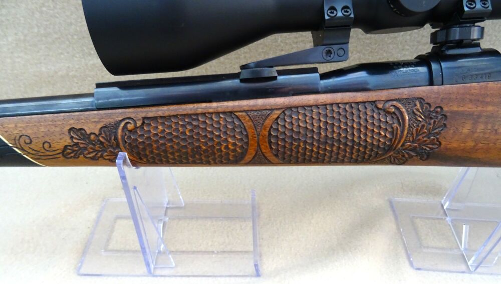 Wir bieten Ihnen eine gebraucht Waffe Der Repetierer des Hersteller Mause, Mod.66 im Kal. .243 Win ist in einem verzierten Holzschaft mit bayrischer Backe und Doppelfalz gearbeitet. Auf der Waffe i... ...weiterlesen