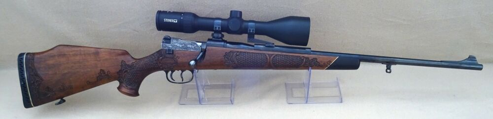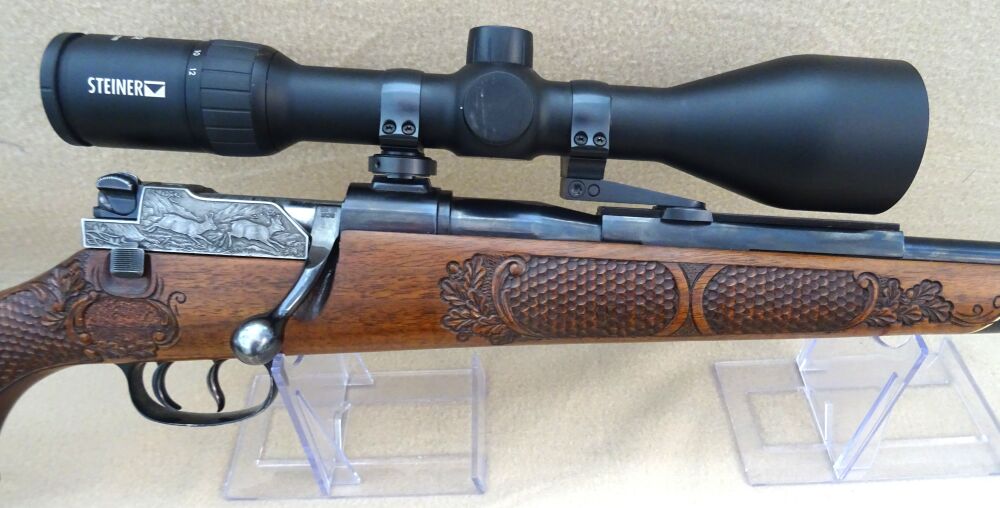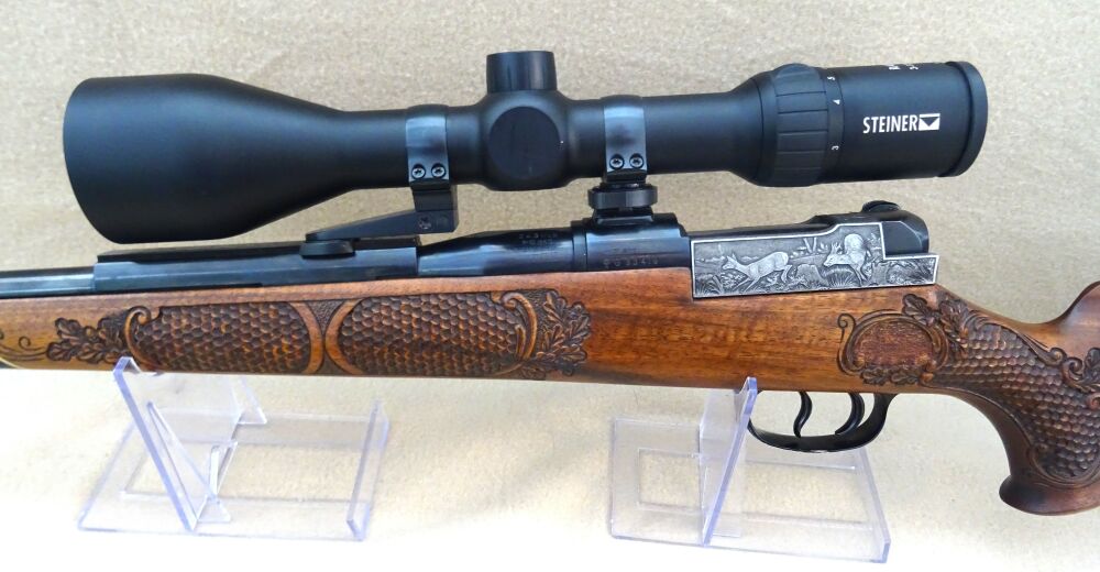 Der Repetierer des Hersteller Mause, Mod.66 im Kal. .243 Win ist in einem verzierten Holzschaft mit bayrischer Backe und Doppelfalz gearbeitet. Auf der Waffe ist ein ZF des Hersteller Steiner.