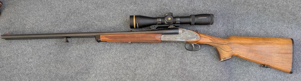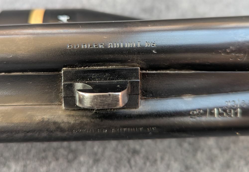 Diese Waffe wurde 1968 als "Working Gun" von J. Hambrusch in Ferlach gebaut und an die Firma Kuchenreuther in Cham geliefert. (Ferlacher Hausnummer 22/xxxx) Außergewöhnliche Doppelbüchse für die Auslandsjagd auf Grosswild (Dickhäuter ausgenommen) oder für den heimischen Drückjagd. Durch die 9,3x64 hat man eine ganz andere Reichweite als die traditionellen 9,3´s und von Leistung her ist man hier gleichauf mit dem bewährten .375 H&H.