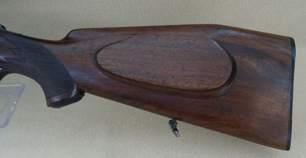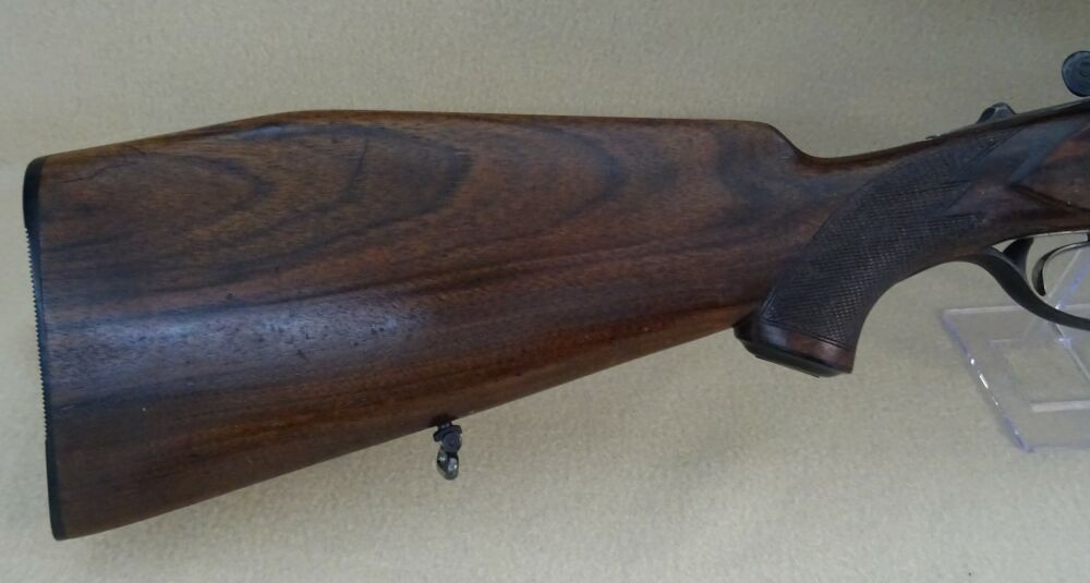 ist in einem Holzschaft mit Deutscher Backe gearbeitet. Auf der Waffe ist ein Zielfernrohr des Hersteller Swarovski.