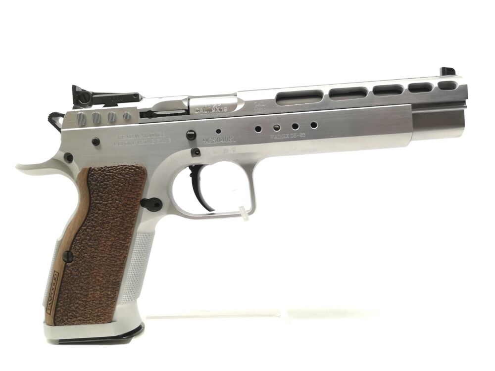 N4025 Tanfoglio - P19 Gold Match BDS - Neuwertig- neuwertige Tanfoglio Gold Match BDS im Kal. 9mm Luger, 6" Lauf, bi-color, Holzgriffschalen, Sicherung Llinksseitig (für Rechtsschützen), LPA-Visierung (seiten- und höhenverstellbar), skelettierter Hahn, perfekte Sportpistole in stainless matt, aufgrund unvorhersehbarem Todesfall sehr geringe Schußbelastung, tecnisch und optisch wie neu, Neupreis ca. 1600 EUR *** voreintragspflichtig *** *** EWB-pflichtig ***