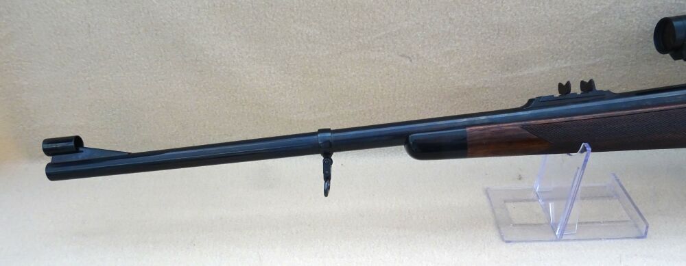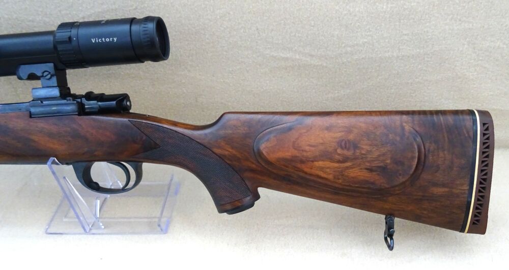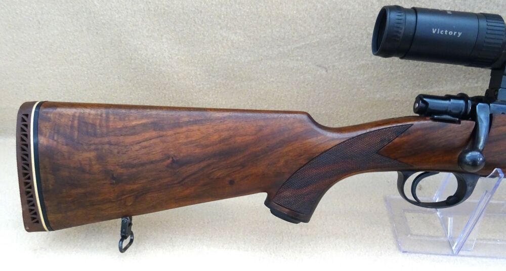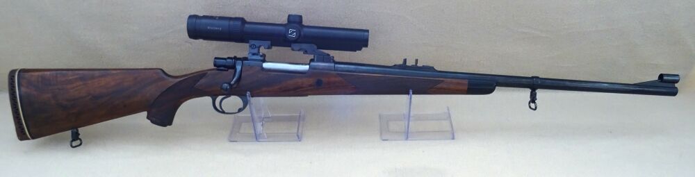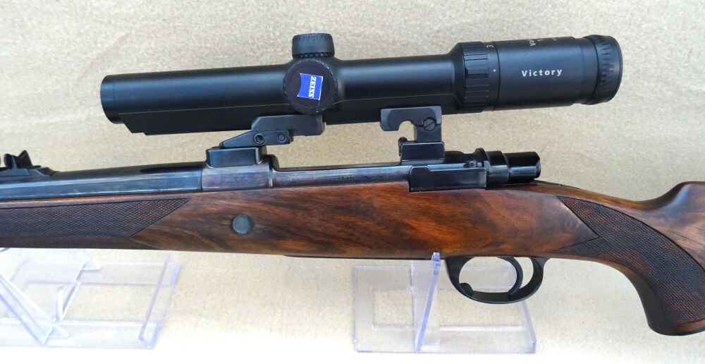 Der Repetierer des Hersteller Interarms, Mod. Whitworth im Kal. .458 Win Mag ist in einem Holzschaft mit deutscher Backe gearbeitet. Auf der Waffe ist ein ZF des Hersteller Zeiss.