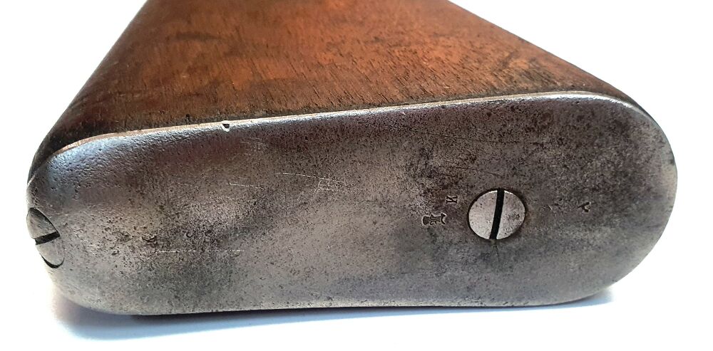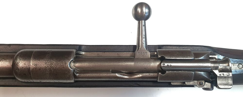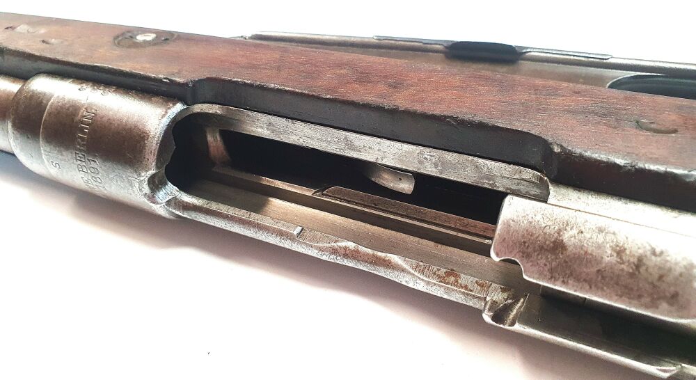 Gebaut wurde das Gewehr 88 aber im Jahr 1891 deshalb ist die Waffe mit Loewe Berlin 1891 gestempelt. Hinzu kommen weitere Stempel wie der Stempel Gew. 88. Unterhalb der Oberseite der Laufhülse sieht man das eingestempelte S das bedeutet, dass die Waffe auf die ab 1904 eingeführte S-Patrone mit ihrem weiteren Geschossraum eingestellt wurde.