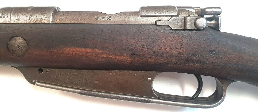 Zum Verkauf steht eine originale historische Repetierbüchse des Typs Gewehr 88 (Kommissionsgewehr) aus deutscher Fertigung, hergestellt von Ludwig Loewe & Co.,Berlin. Das Gewehr 88 wurde im Jahr 1888 als Ordonnanzwaffe des Deutschen Kaiserreichs eingeführt. Die preußische Gewehrprüfungskommission (G.P.K.) entwickelte das Gewehr 1888, daher wurde es Gewehr 88 genannt und zählt zu den ersten modernen Militärgewehren mit rauchloser Pulvermunition.