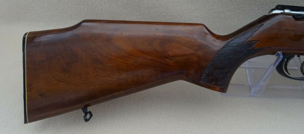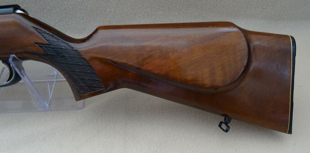 Der Repetierer des Hersteller Anschütz im Modell 1415, im Kal. 22 Lr ist in einem Holzschaft mit Backe und Monte Carlo Effekt gefertigt. Auf der Waffe ist ein ZF des Hersteller Akah.