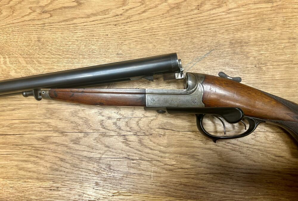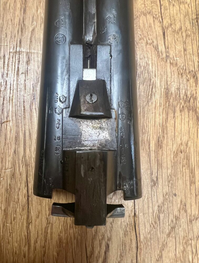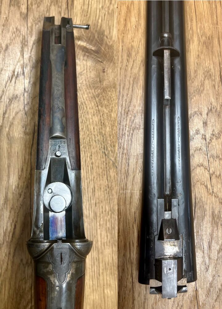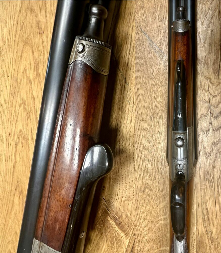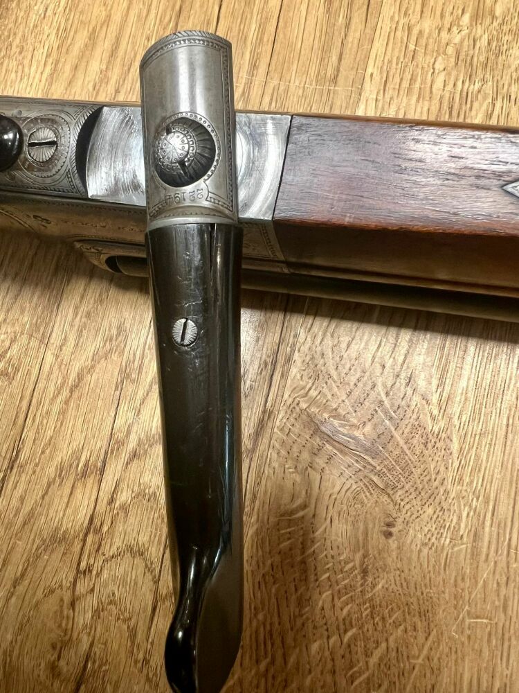 Es handelt sich um eine Doppelflinte mit Exzenterverschluss und Hornhebel.