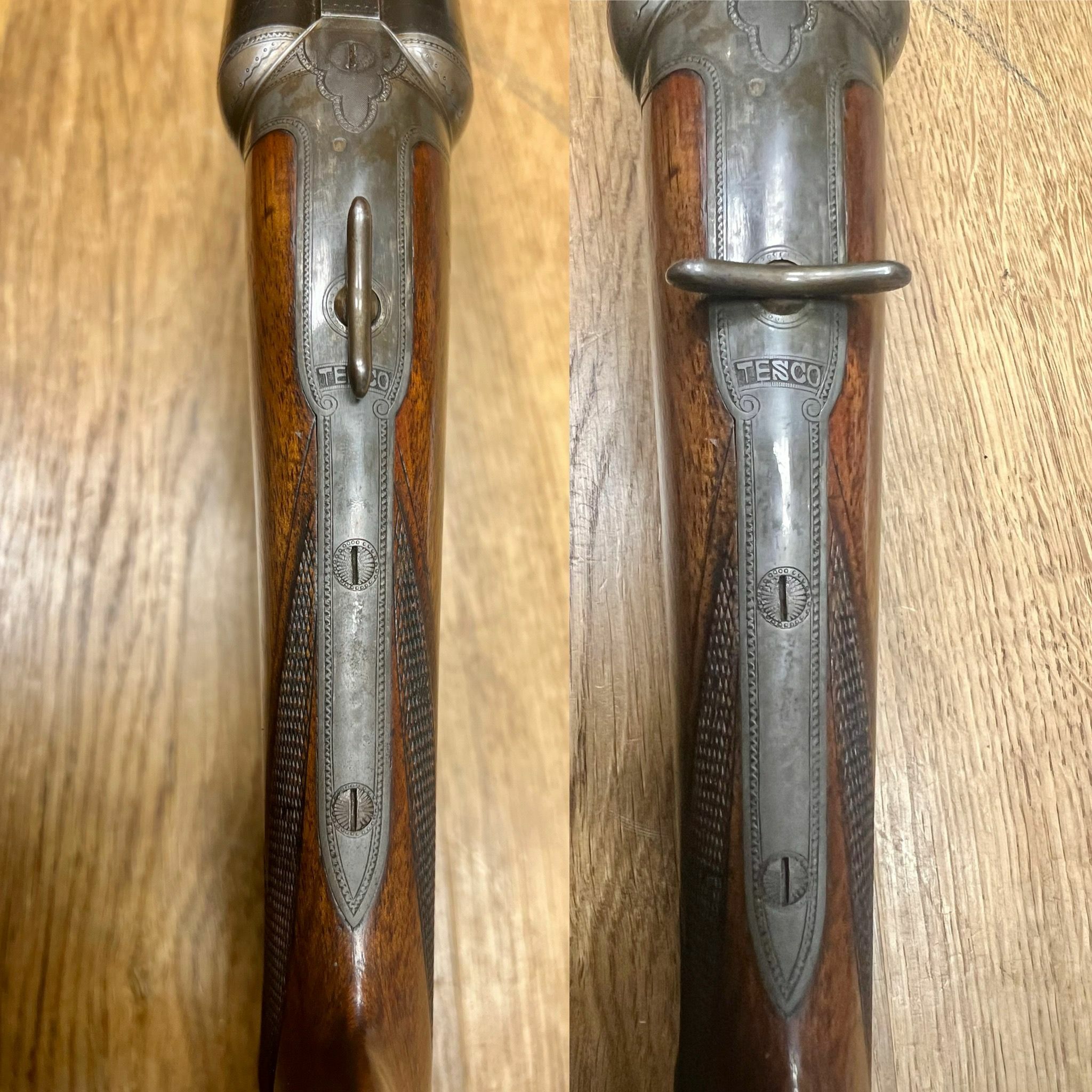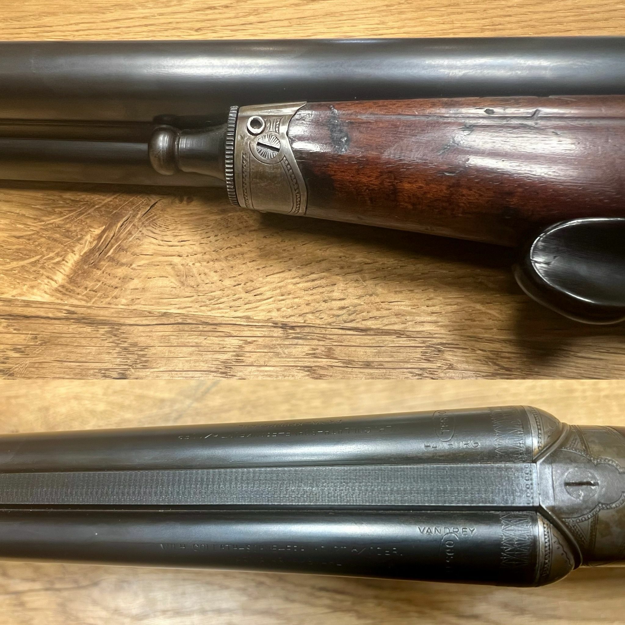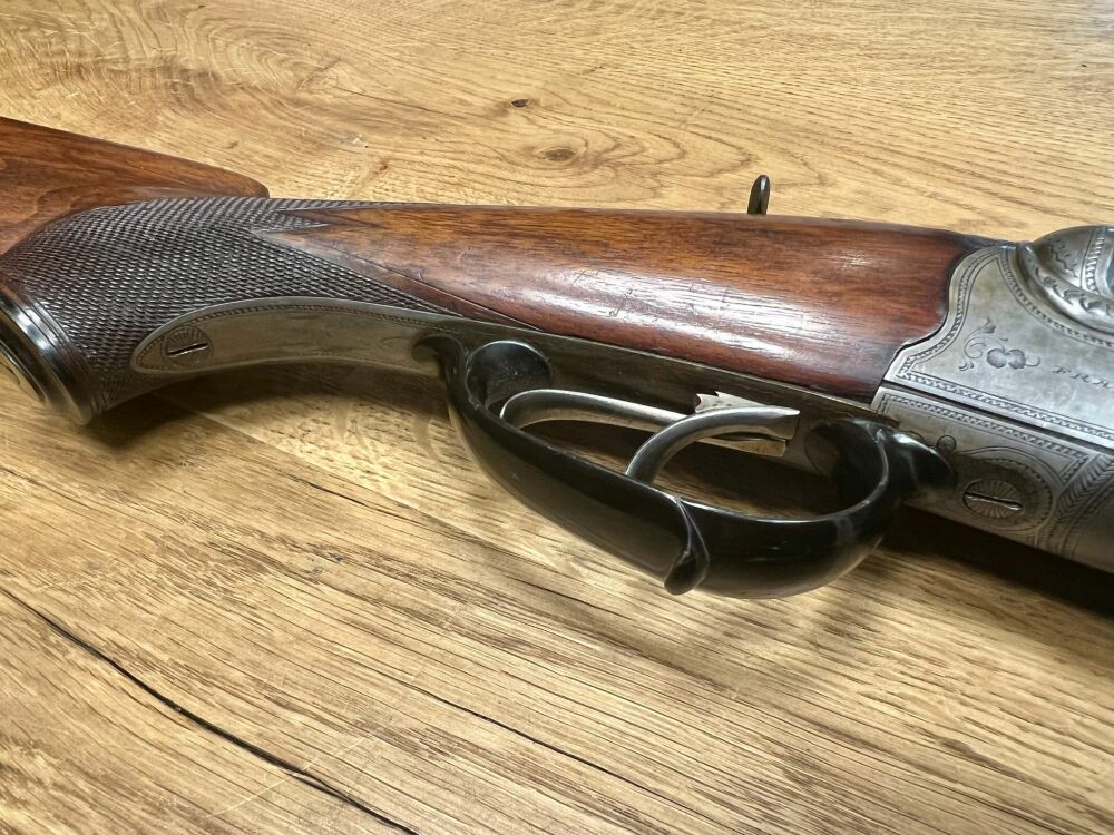 Es handelt sich um eine Doppelflinte mit Exzenterverschluss und Hornhebel.