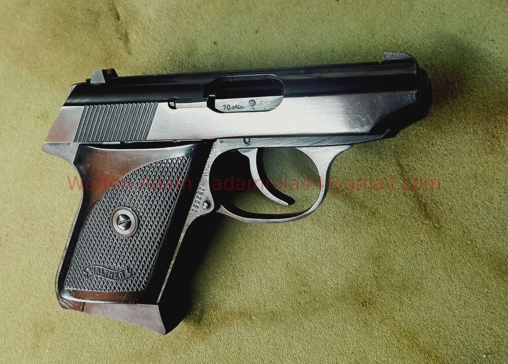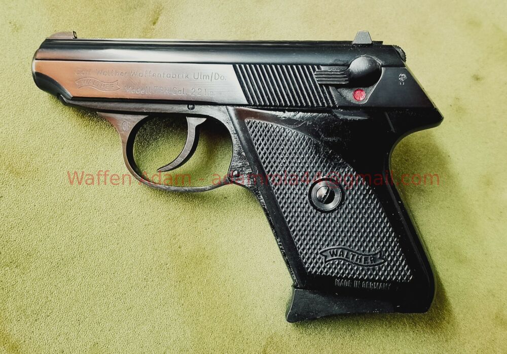 Walther Taschenpistole TPH, im Kaliber .22lr, aus früher Fertigung 1970. Hochglanzpoliertes Zwischenmodell, schon mit geänderter Abzugsklinke / Auslösehebel. Noch mit 2 Zeiliger Beschriftung Carl Walther Waffenfabrik Ulm/Do / Modell TPH Cal. 22l.r. frühe Griffschalen mit Anspritzstelle.