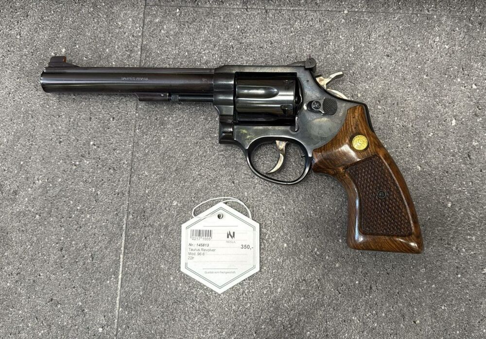 Zum Verkauf steht ein Taurus Model 96 Revolver im Kaliber .22 LR mit 6" (ca. 15 cm) Lauf. Die Waffe ist brüniert und befindet sich in gutem, gepflegtem Zustand. Die originalen Holzgriff... ...weiterlesen