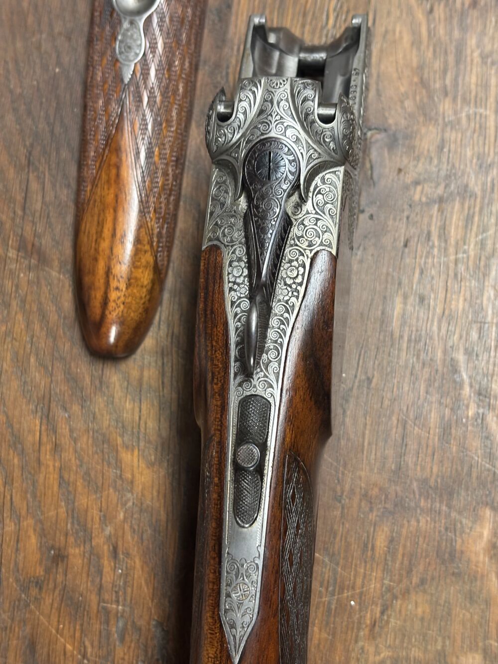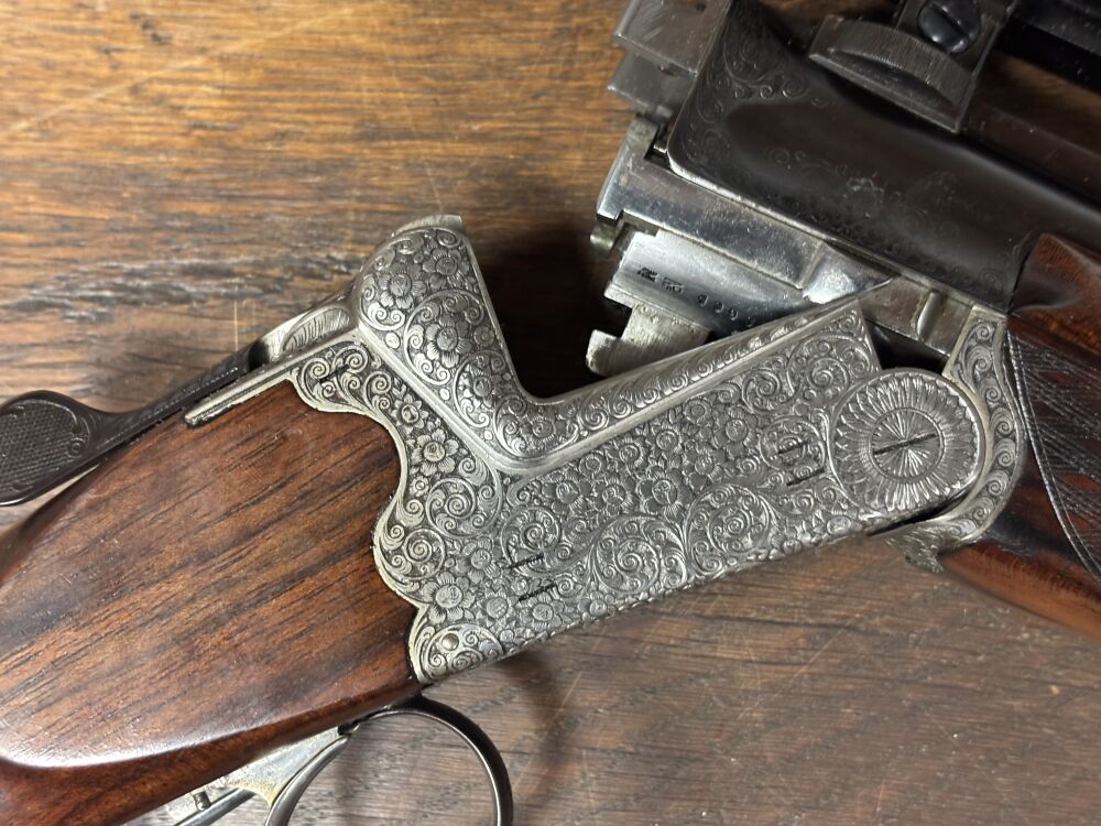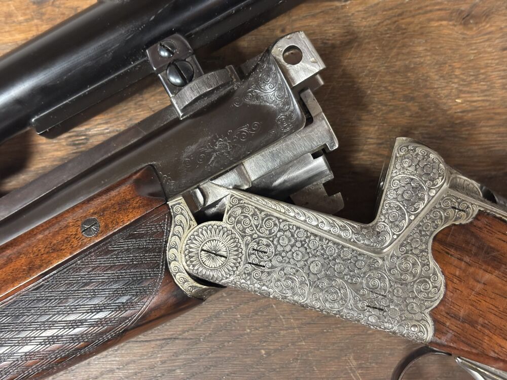 Eine sehr führige und elegannte Bockdoppelbüchse für Krausser München in Ferlach gebaut mit Ferlacher Beschußzeichen.Mit feiner Arabeske graviert,die Schäftung mit einem sehr schönem Wurzelholz mit Fe... ...weiterlesen