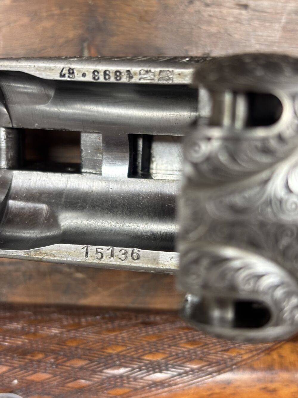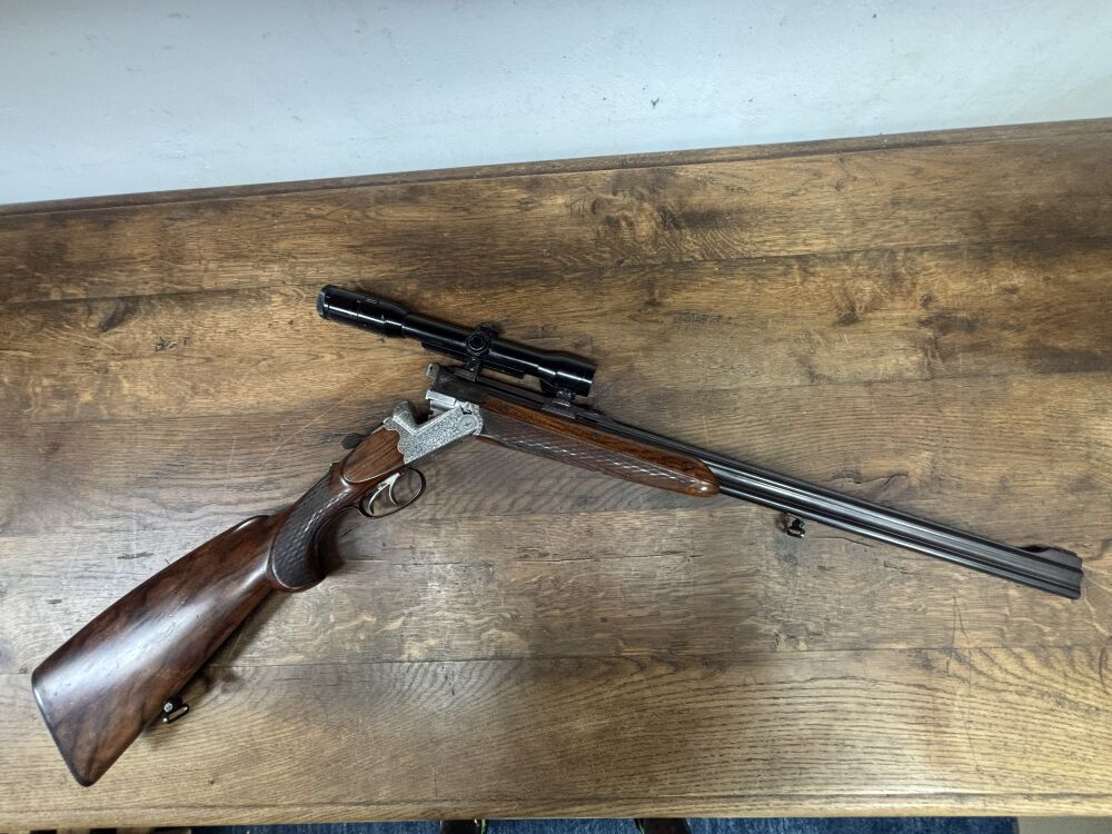 Eine sehr führige und elegannte Bockdoppelbüchse für Krausser München in Ferlach gebaut mit Ferlacher Beschußzeichen.Mit feiner Arabeske graviert,die Schäftung mit einem sehr schönem Wurzelholz mit Ferlacher Backe und Pfeifenkopfgriff und schottischer Fischhaut.Die Bockdoppelbüchse hat eine sehr gute Schußleistung.
