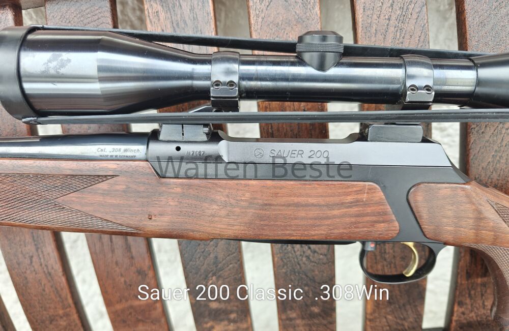Sehr schöne Sauer 200 Classic Kal. .308Win, montiert mit EAW Schwenkmontage Zeiss 6x42 Stahlglas, Abzug mit Rückstecher und vergoldet, AL37cm, LL62cm. ...weiterlesen