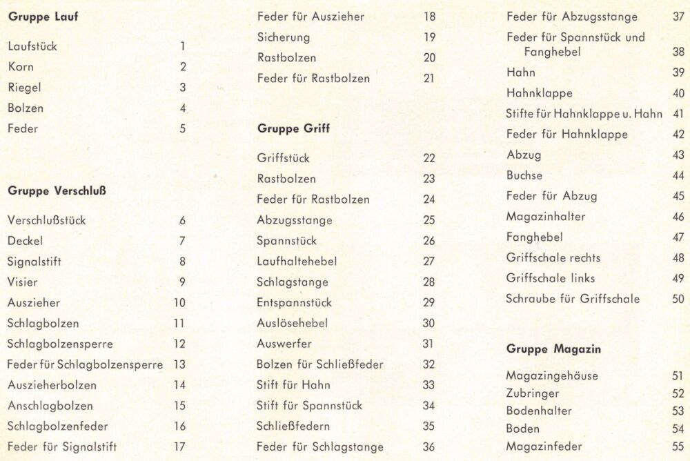 Umfangreicher Teilesatz Walther P1 der Bundeswehr 24 Teile - (35) Schließfeder x2 - (32) Bolzen für Schließfeder x2 - (19) Sicherung komplett - (46) Magazinhalter - (39) Hahn komplet... ...weiterlesen