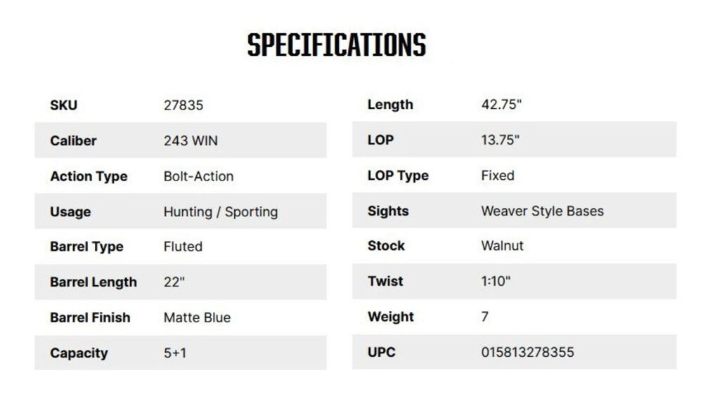 Kaliber .243Win, Rep.Büchse Patriot Walnut 5+1 Patronen, Lauflänge 22"/55,9cm, kannelierter Verschluss, Lauf gefluted, entnehmbares 5/fünf Patronen Magazin, Weaver Style Montage 2-teilig, schöne Schäftung aus amerikanischem Walnussholz, Lauf und System matte Brünierung schwarz, Patented LBA® Abzug verstellbar von 2lbs/908gramm bis 7lbs/3.178gramm, Gesamtlänge 42,75"/108,6cm, Gewicht 7lbs/3.178gramm, Code 27835 Mossberg USA.