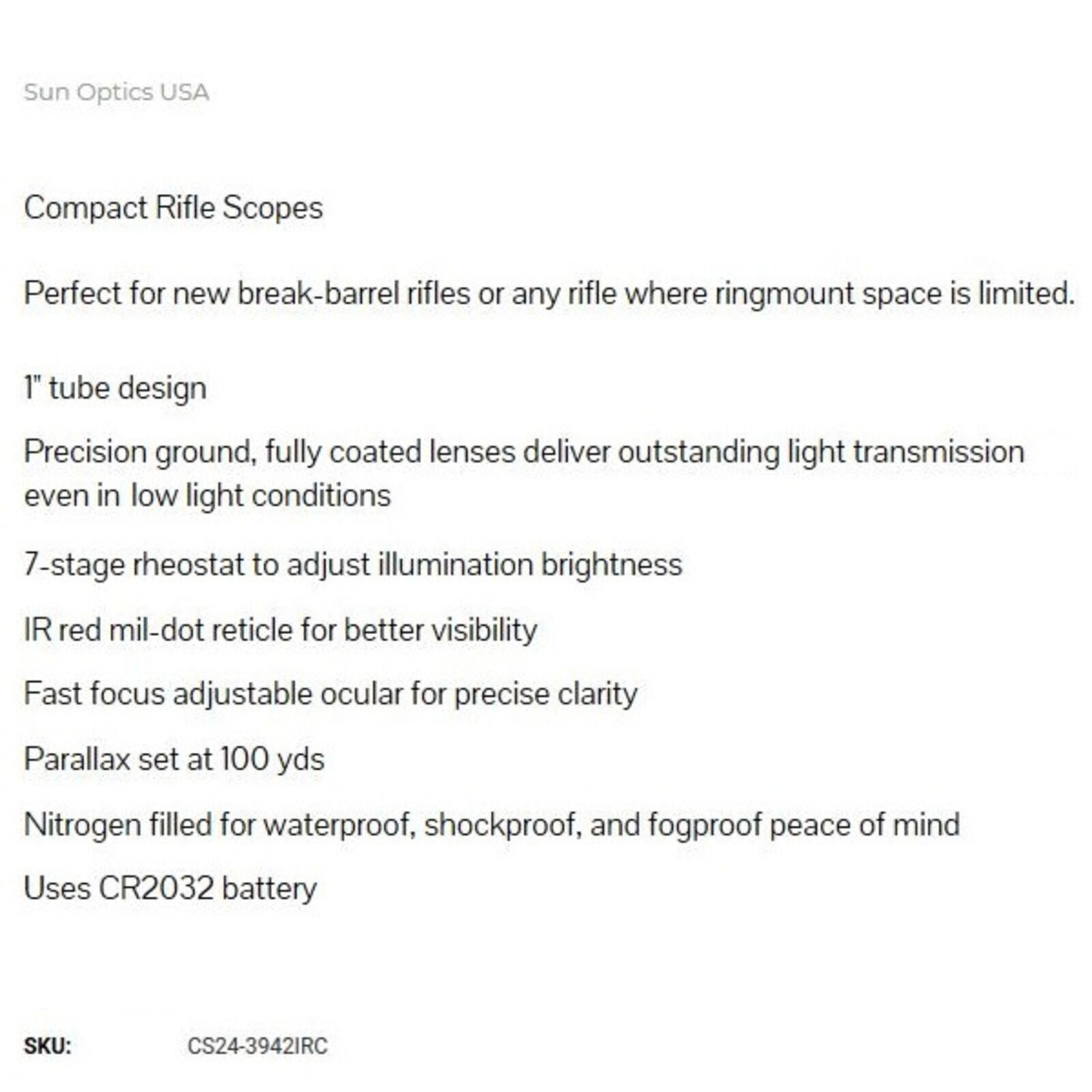 Zielfernrohr Compact 3-9x42, Absehen Mil-Dot schwarz oder beleuchtet rot, Mittelrohrdurchmesser 1"/25,4mm, Länge 9"/229mm, Sun Optics USA. Eine fachgerechte Montage wird empfohlen!