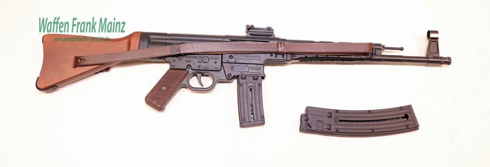 ungeschossen, aus Sammlungsauflösung, der perfekte Nachbau des berühmten Sturmgewehrs, wurde 1944 von Hugo Schmeisser entwickelt und beeinflusste viele Gewehrkonstruktionen der Nachkriegsjahre, Vollmetallausführung mit echtem Holzschaft, die Langwaffe ist für das sportliche Schießen zugelassen, mit einem 10 Schuss und 24 Schuss Magazin, (beste Funktion mit HV-Munition mit verkupfrtem Geschoss), mit stilechtem Lederriemen, noch verkäuflich als Selbstladebüchse auf Jagdschein oder mit Voreintrag auf grüner WBK