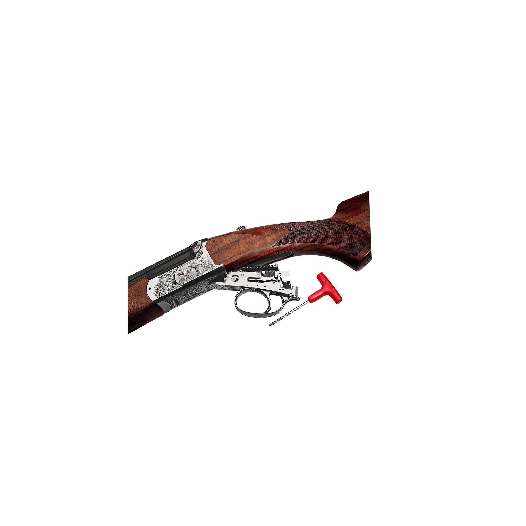 Sie überzeugt aufgrund edler Gravur, Schäftung aus ausgesuchtem Walnussholz, fein ziselierter Fischhaut, einer Schaftkappe aus Holz und ihren kompakten Abmessungen. Mit dem mitgelieferten Werkzeug kann die Abzugsplatte schnell und einfach aus der Basküle entfernt werden. So ist sie schnell zu ersetzen oder zu warten. Auf die Basküle sind elegante Jagdszenen graviert: auf der Unterseite ein Fasan im Flug, auf den Seitenflächen fliegende Enten und Rebhühner.