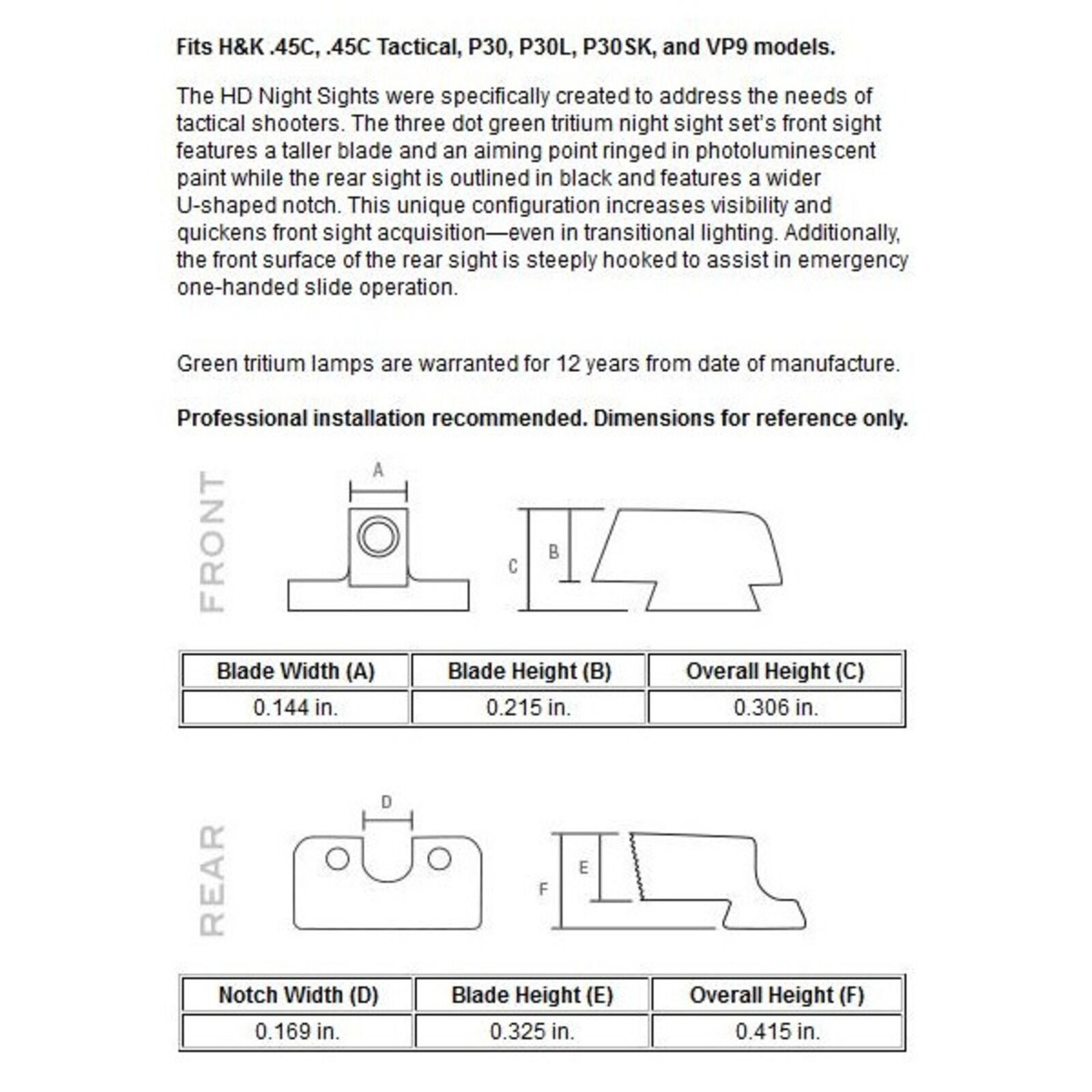 Heckler & Koch 45 Compact, Tactical, P30, P30L & VP9 Pistole, Night Visierset HD grün, Visierkorn gelb selbstleuchtend, Trijicon USA. Nacharbeiten sind eventuell erforderlich - eine fachgerechte Montage wird empfohlen!