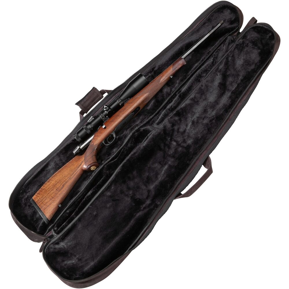 Das Gewehrfutteral "All-in" ist aus echtem Leder gefertigt und verstaut, wie der Name schon sagt, alles wichtige übersichtlich in einer Transporttasche.