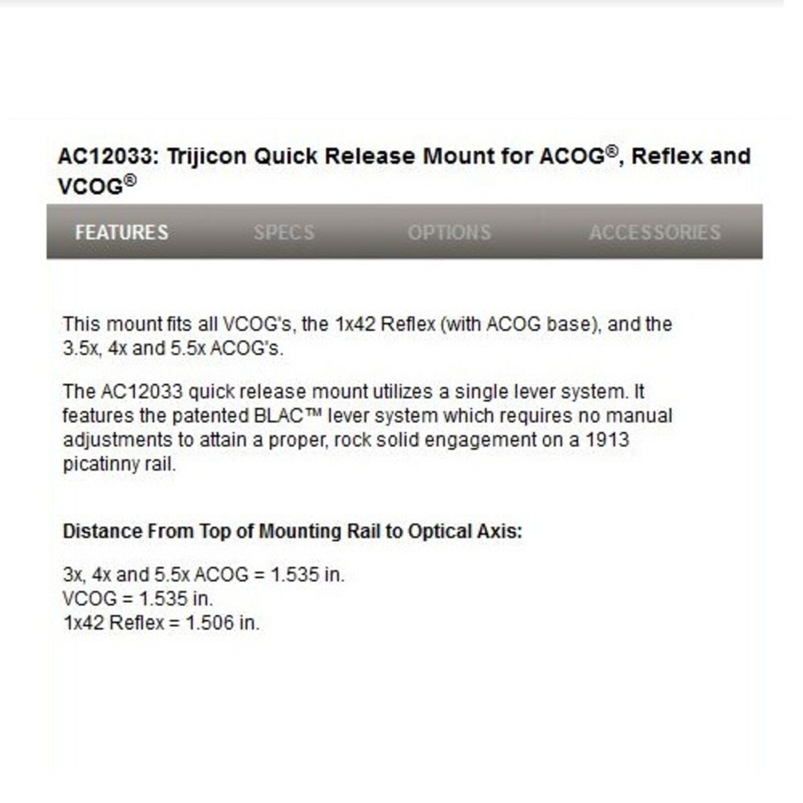 Für alle VCOGs, Reflex 1x42 mit ACOG Base & ACOG 3.5x, 4x & 5.5x Modelle, Schnellspannmontage Picatinny 1913 schwarz, Befestigungsschrauben, Code AC12033 Trijicon USA.