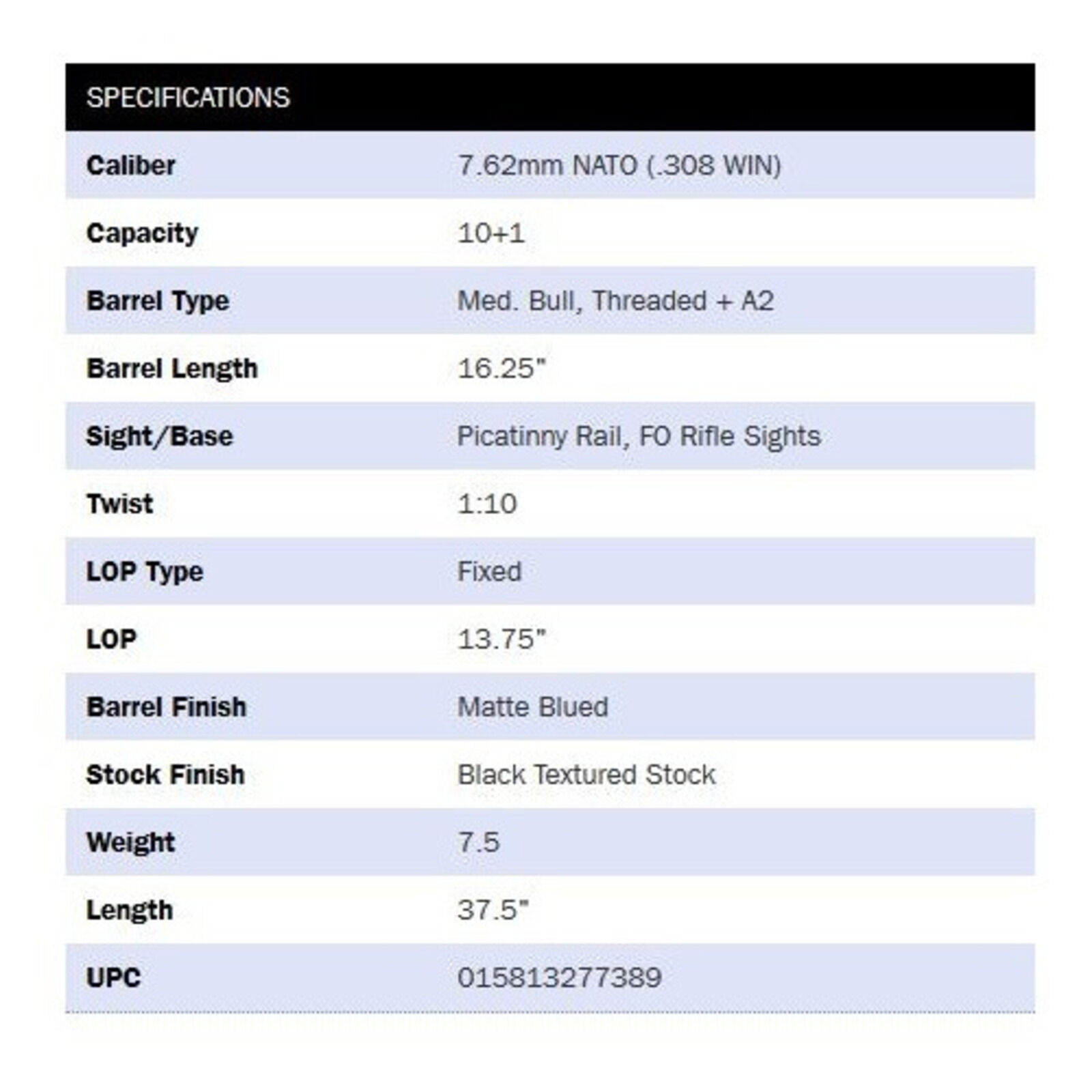 Kaliber .308Win, Rep.Büchse MVP Patrol 10+1 Patronen, Med.Bull Lauf gefluted mit Mündungsgewinde Länge 16,25"/41,3cm, kannelierter Verschluss, offenes Visier mit Visierkorn Fiber rot, entnehmbares 10/zehn Patronen Magazin, Picatinny Montageschiene 1-teilig, Schäftung Textured schwarz, Lauf und System schwarz matt, Gesamtlänge 37,5"/95,25cm, Gesamtgewicht 7,5lbs/3.405gramm ohne Munition, Code 27738 Mossberg USA.