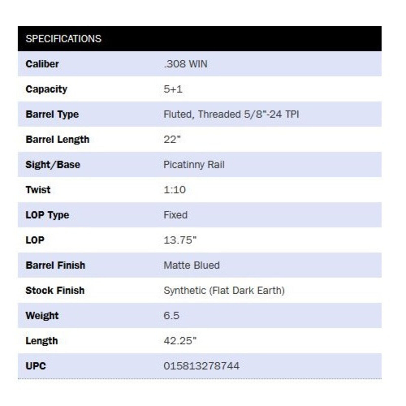 Kaliber .308Win, Rep.Büchse Patriot Predator 5+1 Patronen, Lauflänge 22"/55,9cm, kannelierter Verschluss, Lauf gefluted mit Mündungsgewinde 5/8"-24, entnehmbares 5/fünf Patronen Magazin, Picatinny Montageschiene, Synthetic Schäftung Flat Dark Earth, Lauf und System Brünierung schwarz matt, Gesamtlänge 42,25"/107,3cm, Gesamtgewicht 6,5lbs/2.951gramm ohne Munition, Code 27874 Mossberg USA. Verkauf solange vorrätig!