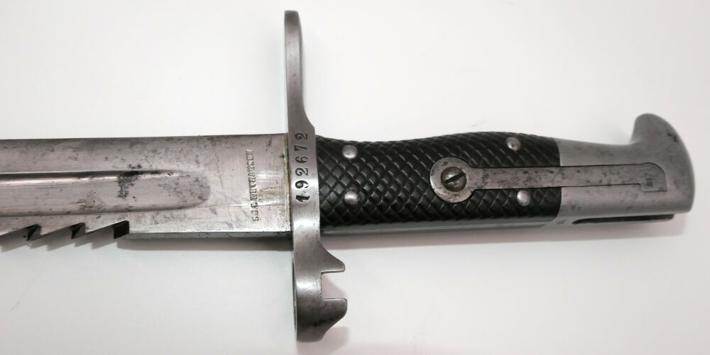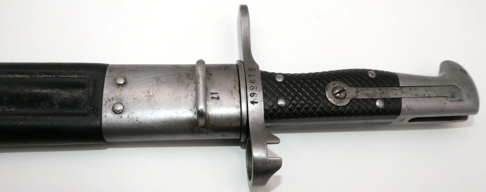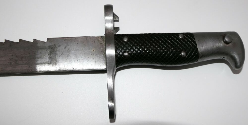 Sägebajonett für Schweizer Repetierbüchse Vetterli Mod1878 Erscheinungsjahr: ab 1878 Seriennummer: 17931 Zustand: gut, Lederscheide leicht abgewetzt Lieferumfang: Bajonett, Scheide Altersnachweiß erforderlich, Frei ab 18 Jahre |