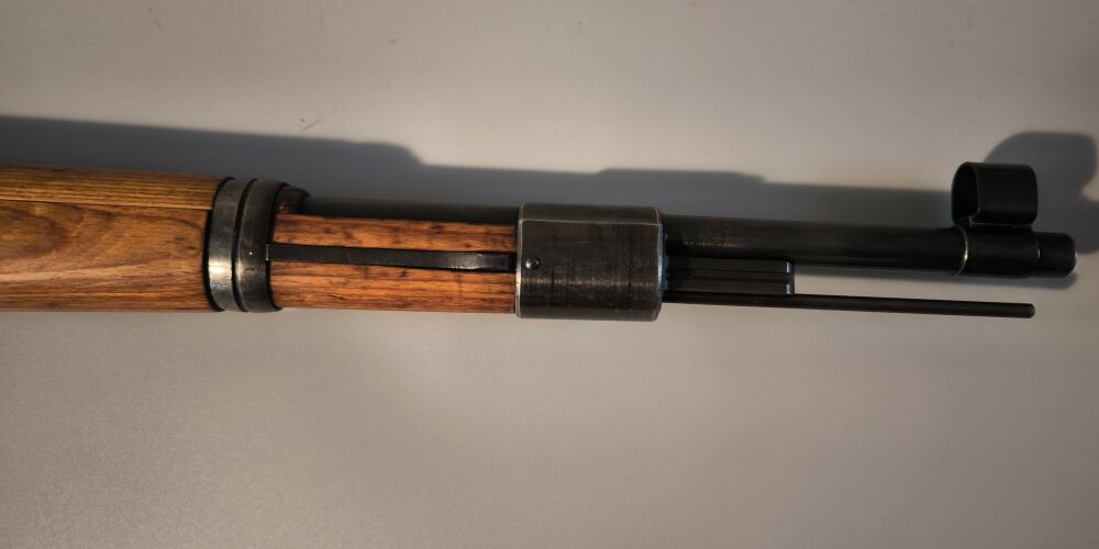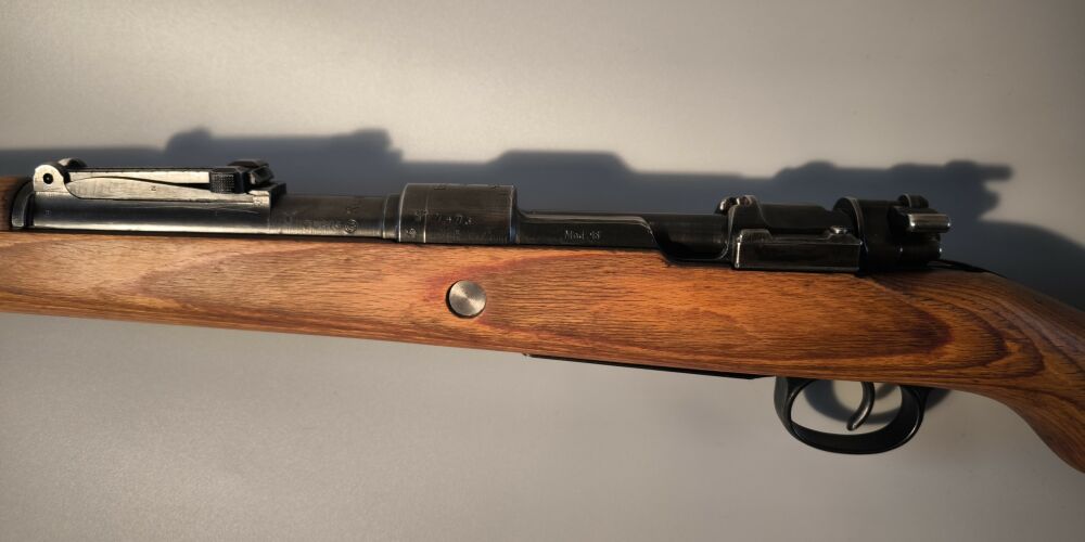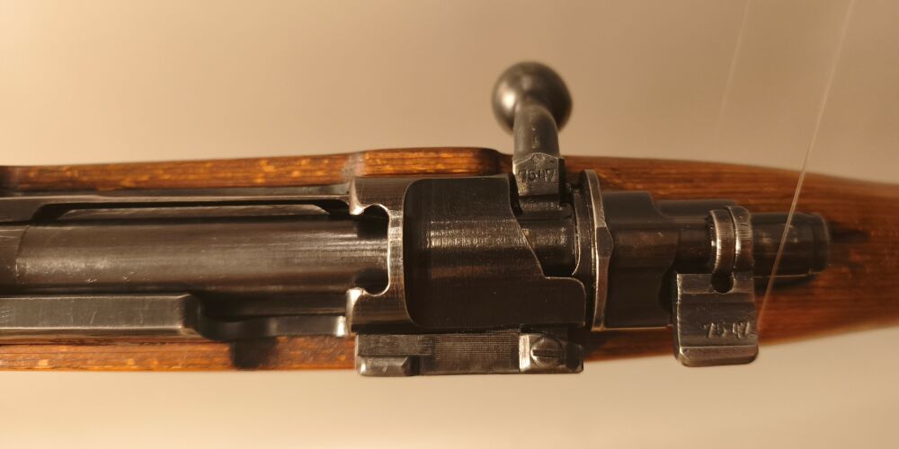 Wehrmachtskarabiner Hersteller BNZ. (Steyr-Daimler-Puch). Im Originalkaliber 8x57IS. Hülse mit Rune gestempelt. Neubeschuss, Schichtholzschaft, hohe Schaftkappe. Guter Zustand.