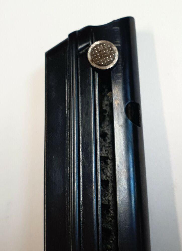 Original Mauser P08 Magazin - 9mm Luger Gebrauchtware, der Magazinboden hat einen Riss und an der Seite eine Delle. (Siehe Bilder) Magazinkapazität: 8  Schuss Kaliber: 9mm Luger Material:Stahl... ...weiterlesen