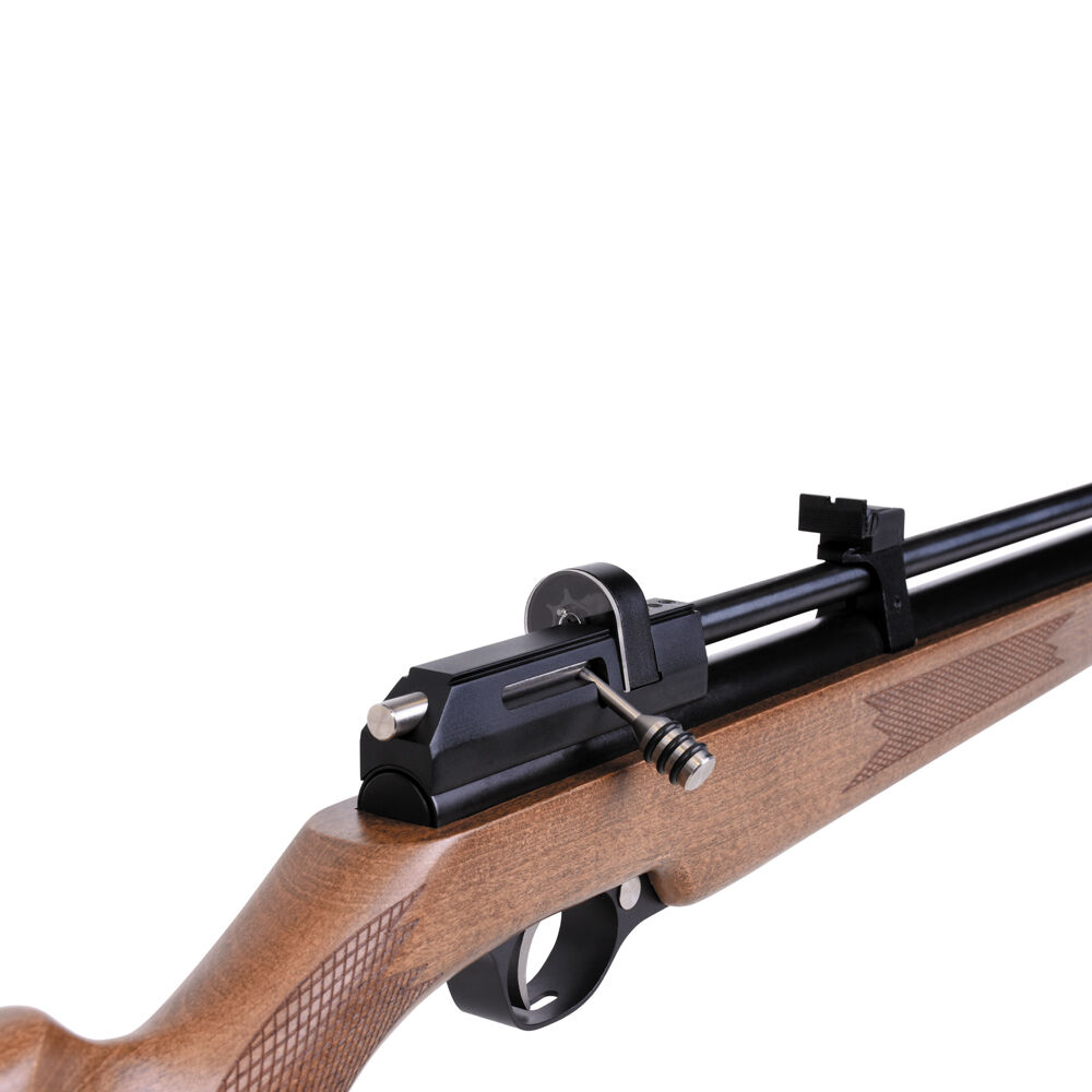 Das Diana Stormrider kann sowohl im Einzelschuss-Modus als auch mit dem mitgelieferten 9-Schuss Magazin betrieben werden. Es verfügt über eine 11mm Prismenschiene, einen Schalldämpfer, eine einstellbare Mikrometer-Visierung, eine gummierte Schaftkappe und eine manuelle Sicherung.