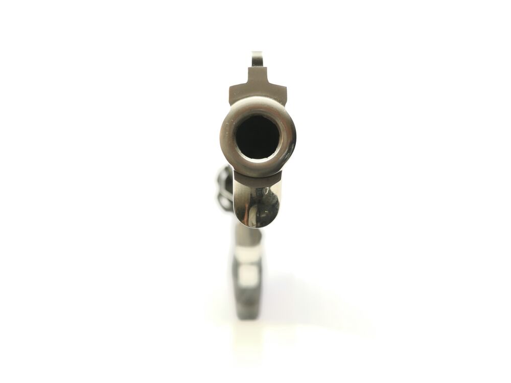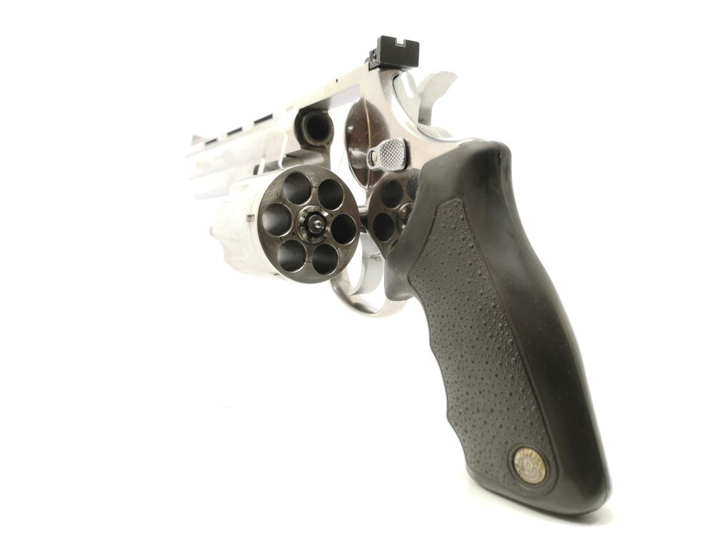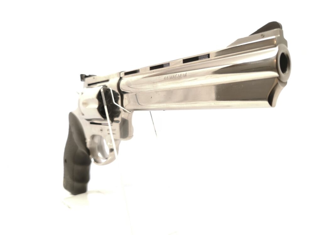 N3623 Taurus - 44 - Note 2 - Magnum-Revolver v. Taurus Brasil, Kal. 44Magnum, schwarze Gummiformgriffschalen mit Fingermulden, 6" Lauf, silberfarben glänzend, beidhändige Nutzung möglich, vebreitertes Abzugszüngel und Hahn, gepflegtr guter optischer Zustand (Note 2) *** voreintragspflichtig *** *** EWB-pflichtig ***
