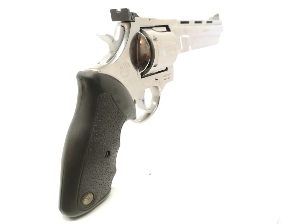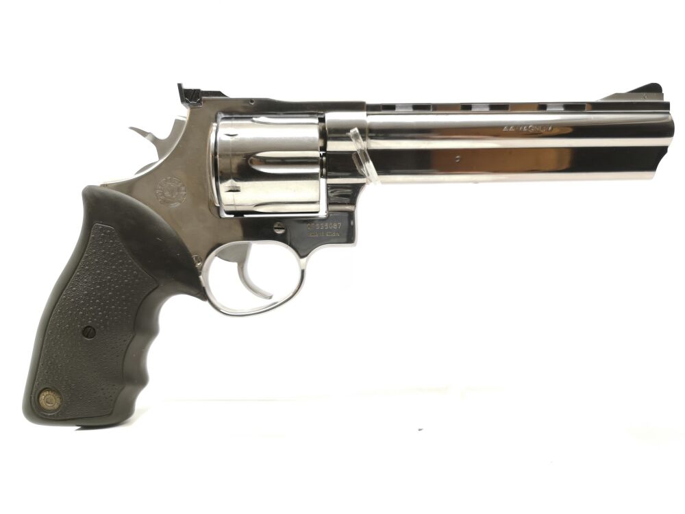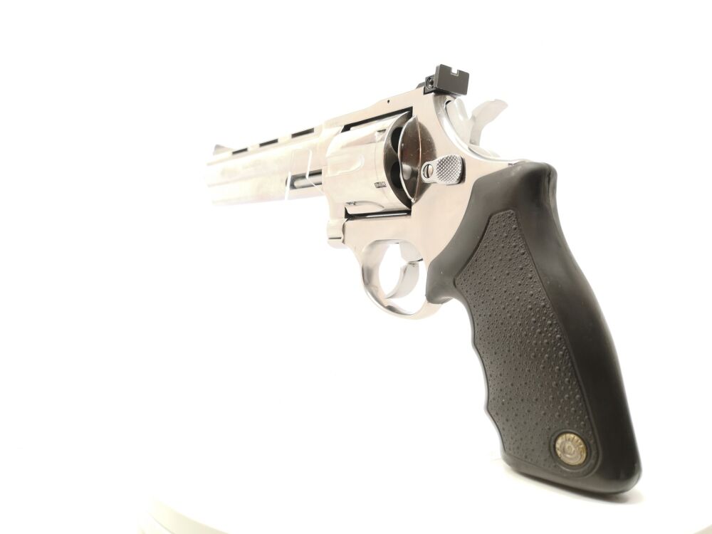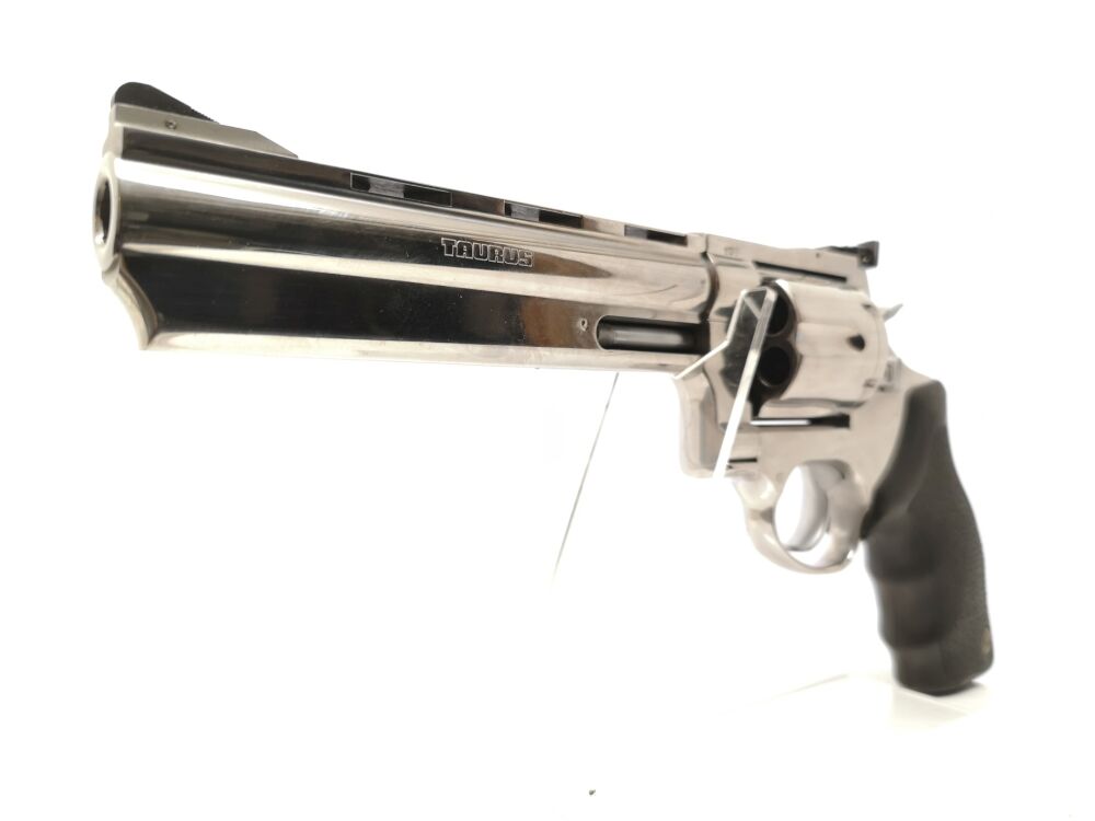 Besonderheit: Magnum-Revolver v. Taurus Brasil, Kal. 44Magnum, schwarze Gummiformgriffschalen mit Fingermulden, 6" Lauf, silberfarben glänzend, beidhändige Nutzung möglich, vebreitertes Abzugszüngel und Hahn, gepflegtr guter optischer Zustand (Note 2) *** voreintragspflichtig ***