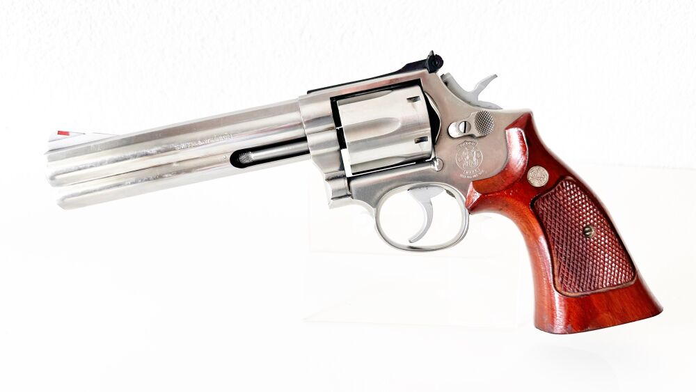 Die Ausführung „-1“ wurde ab Mitte der 1980er-Jahre produziert und zeichnet sich durch technische Verbesserungen gegenüber dem ursprünglichen 686 aus. Der Revolver ist komplett aus gebürstetem Edelstahl gefertigt – witterungsbeständig, pflegeleicht und optisch ein Highlight.