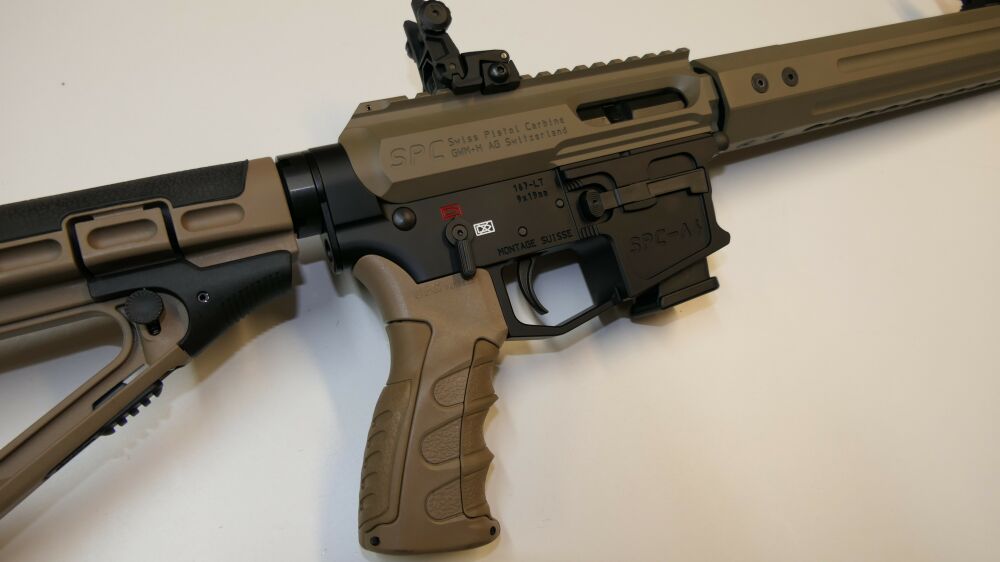 - NEUHEIT - Neuwaffe Wir verkaufen Selbstladebüchse GWMH SPC-SPORTER A4 (SWISS PISTOL CARBINE) FDE (Flat Dark Earth) mit Kompensator RECLESS SPC 17" im Kaliber 9x19 und Teleskopschulterstütze. ... ...weiterlesen