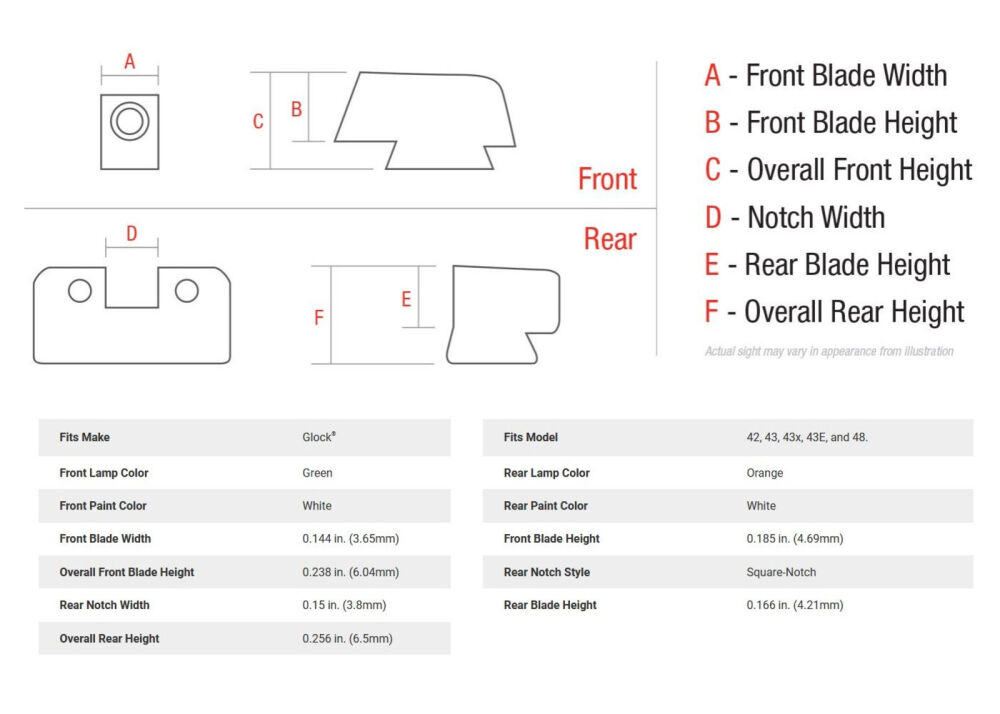 Pistole Glock Modell 42, 43, 43x, 43E & 48, Nacht Visierset orange mit Visierkorn grün selbstleuchtend mit/und 3-Dot weiß umrandet Daylight, Serie Bright & Tough, Code GL13 Trijicon USA. Nacharbeiten sind eventuell erforderlich - eine fachgerechte Montage wird empfohlen!