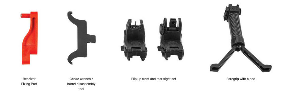 Zusätzlich wird die SDX12-TS durch ein hochklappbares Korn- und Kimmenset ergänzt. Außerdem ist ein taktischer Handgriff mit integriertem Zweibein und Riemenbügelhalterungen im Lieferumfang enthalten.