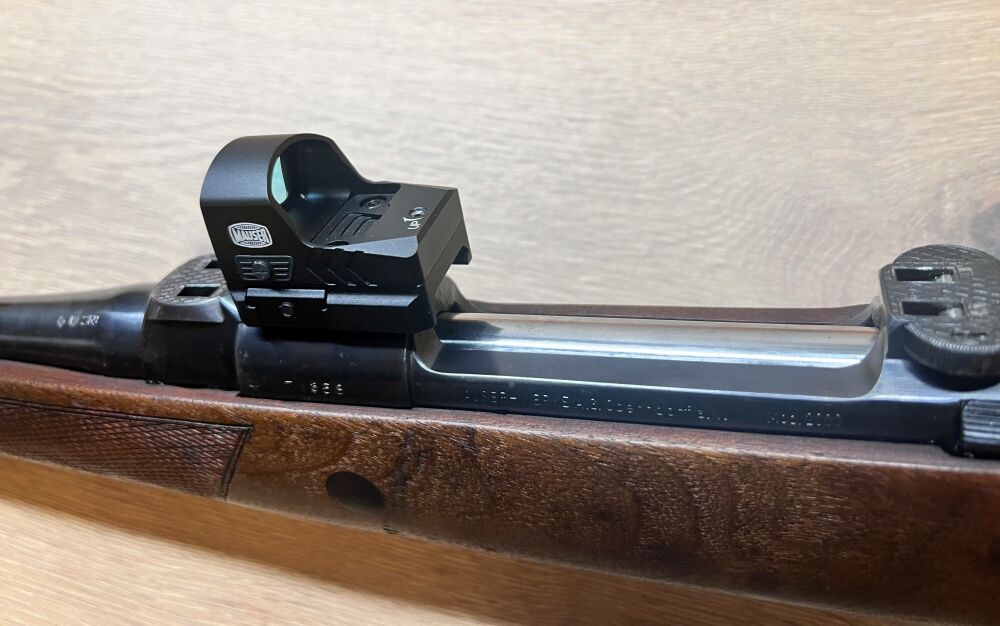 Dank der optionalen Picatinnyschiene, die wir auf Wunsch montieren, auch zur Aufnahme eines Rotpunktvisiers geeignet und damit ideal als Durchgehwaffe.