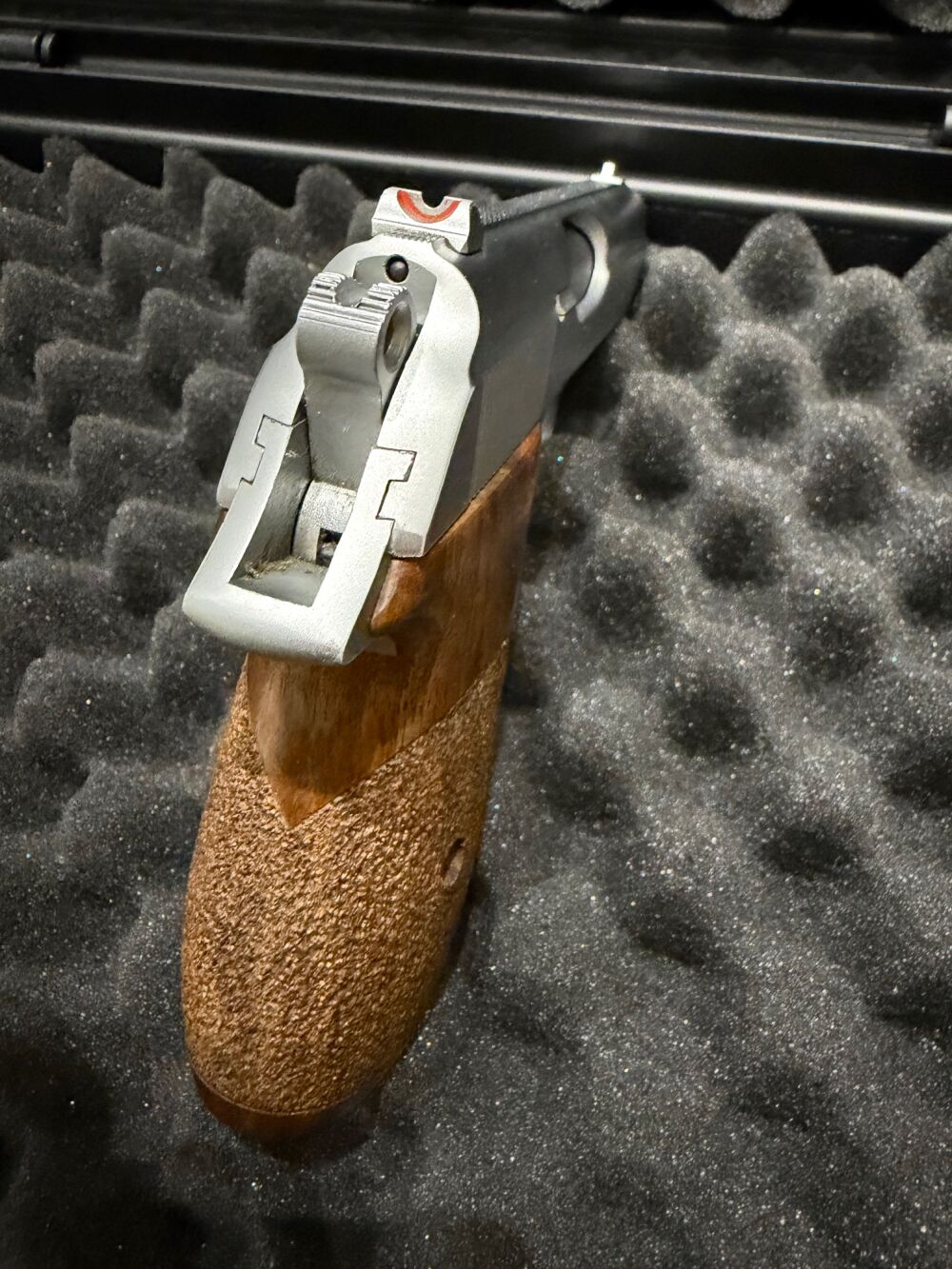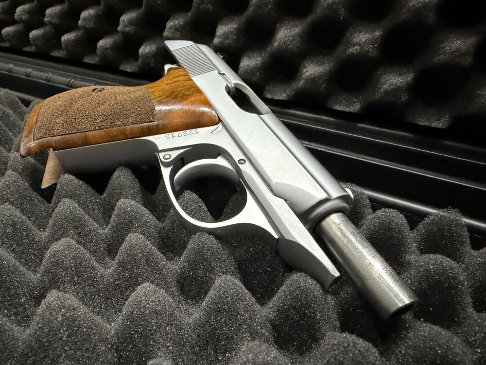 Die Waffe kommt mit zwei Magazinen und Holzgriffschalen. Bei der Pistole handelt es sich um das Ulmer Modell.