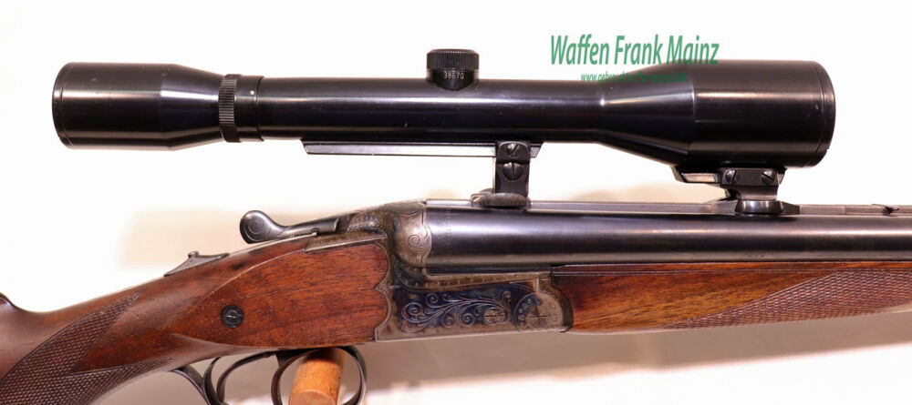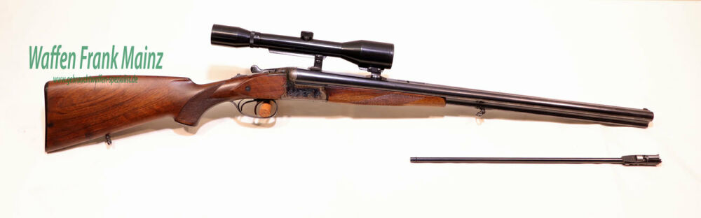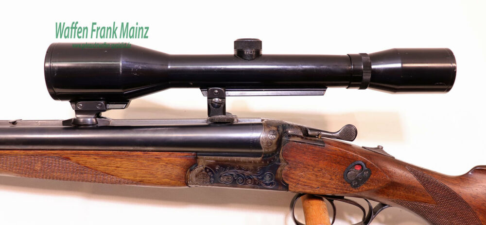 selten geschossene Schrankwaffe, noch aus hochwertiger Suhler Exportfertigung, mit zusätzlicher Stempelung "Q"= ausgesuchte Exportqualität, klassisches Blitzschloss in bunt gehärtetem Stahlsystem, noch mit aufwendigen, zusätzlichen Verschlussstützwangen, Nussbaumschaft mit Backe für Rechtschützen, Schaftlänge 365mm, mit später ergänztem Krieghoff Einstecklauf Kal. .22Magnum, Länge 44cm, mit ausgesuchter Werksschussleistung "extra", Suhler Einhakmontage mit ZF Schmidt & Bender als Hausmarke für Frankonia gefertigt 6x42 Absehen 1...die perfekte, ganzjährige Universalwaffe für alle Jagdsituationen....