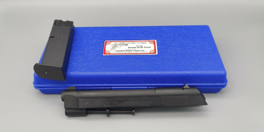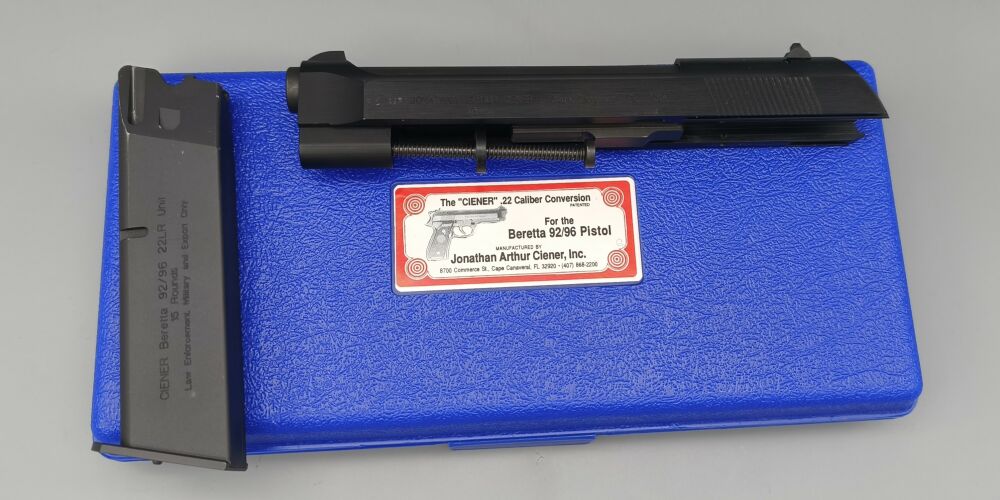 Gebrauchtes sehr gut erhaltenes Ciener Wechselsystem für Beretta 92 und 96 Fullsize Pistolen. Inkl. original Box und einem Magazin. Funktion und Präzision mit der ebenfalls angebotenen Hauptwaffe getestet. Ohne Beanstandung. Bitte beachten, dass wie immer bei derlei Wechselsystemen minimale Anpassungsarbeiten an die Trägerwaffen erforderlich sein können. Normalerweise laufen diese Systeme aber ab Werk problemlos.