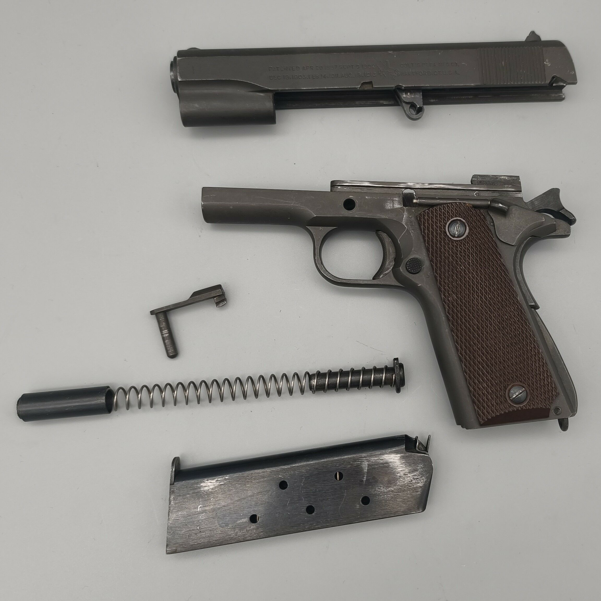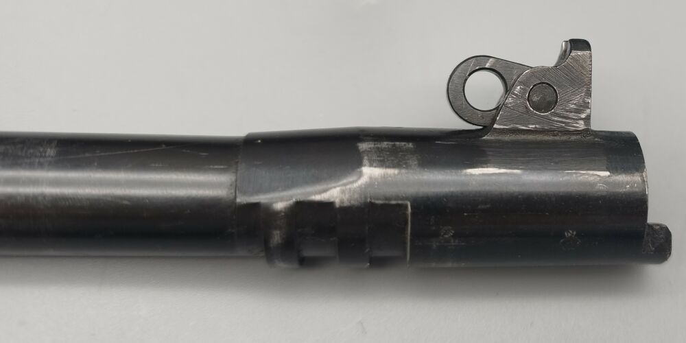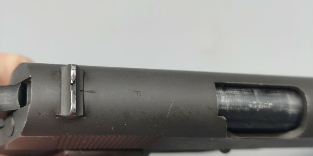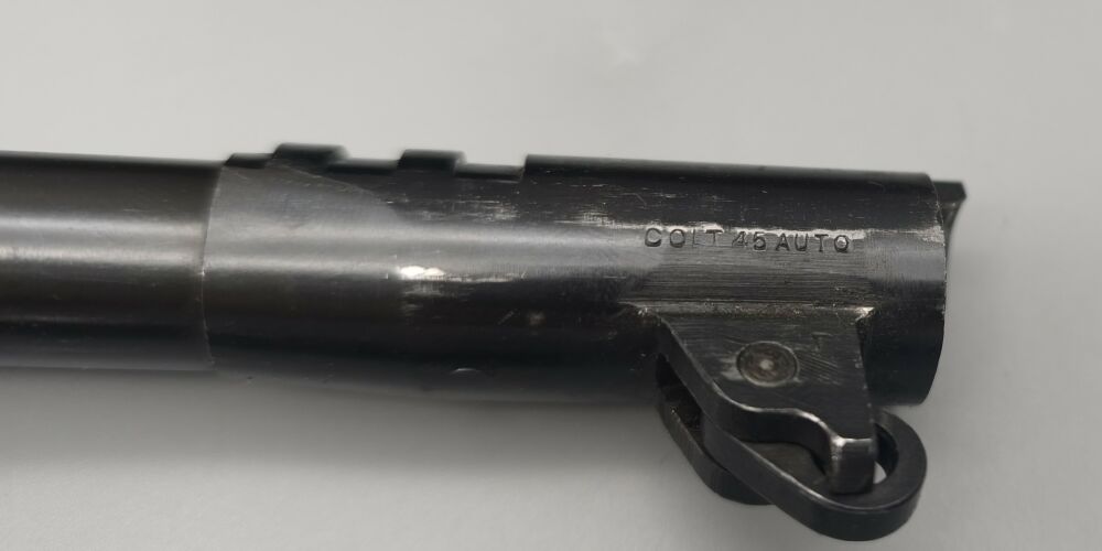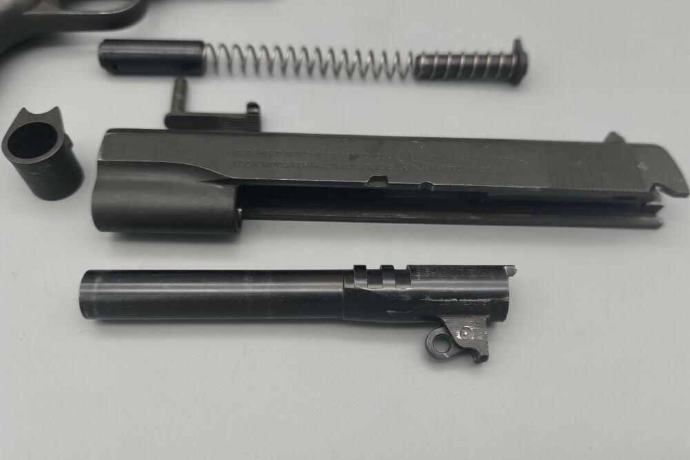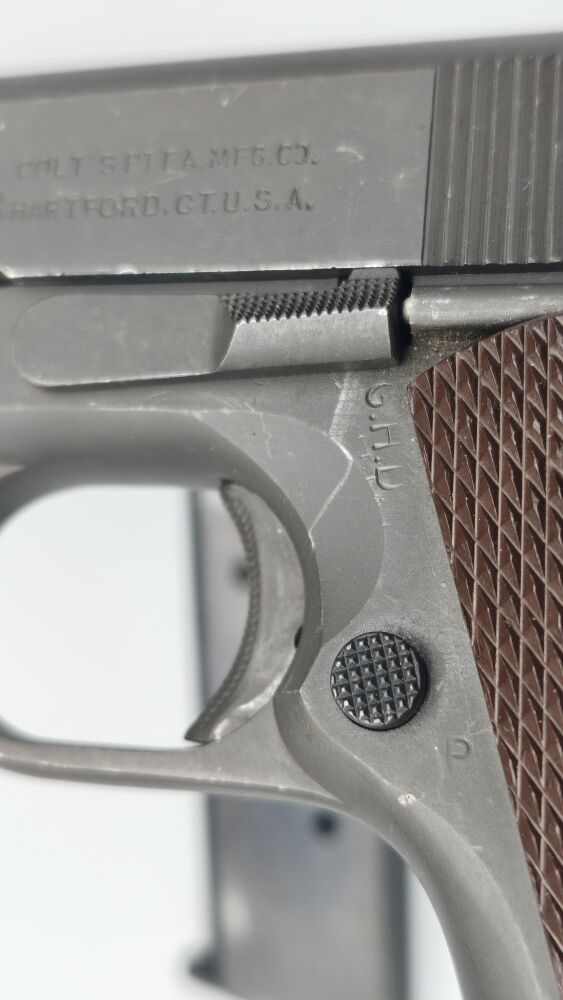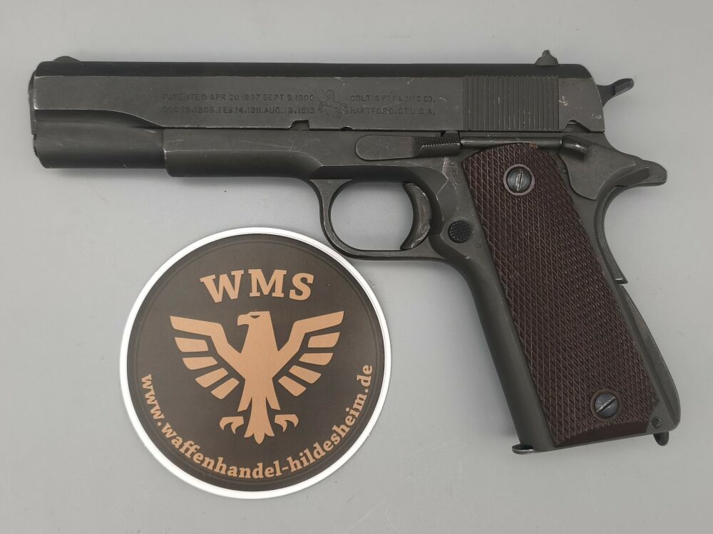 Original Colt 1911A1 im Kaliber .45 ACP der US Army aus der Zeit des 2. Weltkrieg. Baujahr laut Colt 1944. Für das alter hervorragender Zustand. Originale mattgraue Werksphosphatierung. NICHT neubrüniert wie man häufig sieht. Original Kunststoffgriffschalen wie zu der Zeit üblich. Das Magazin müsste auch original sein (Siehe Bilder). "P" Stempel oben auf dem Verschluss und am Griffstück in der Nähe des Magazinauswurf. G.H.D. Stempel unter Verschlussfanghebel. Voll funktionsfähig. Gültiger Beschuss! Weitere Abnahmestempel auf den Bildern ersichtlich. Leicht beriebene Beschichtung. Keine groben Kratzer oder Beschädigungen. Sauberes Tragbild an Verriegelungskamm und Kettenglied. Originallauf mit Colt 45 Auto Markierung und Werksbrünierung.